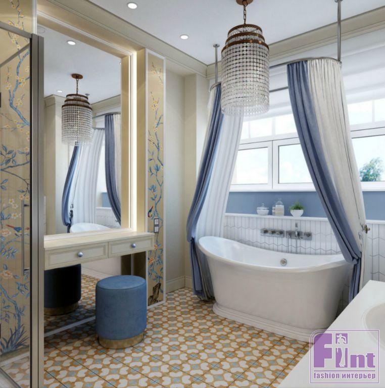 Ванная комната немного выделяется на фоне деликатной классики интерьера квартиры. Японские мотивы на стенах, роскошная люстра и ванна утончённой формы сделали комнату необыкновенно изысканной.