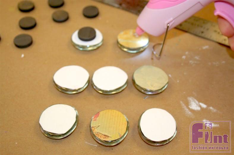 После высыхания клея (примерно через 15-20 минут), приклейте к задней стороне магнита предварительно вырезанный по контуру кружок из бумаги или ткани и оставьте изделие сохнуть, как минимум, на ночь. После чего, при помощи клеевого пистолета приклейте на горячий клей магнитные полоски или кружочки. Наши магниты готовы!