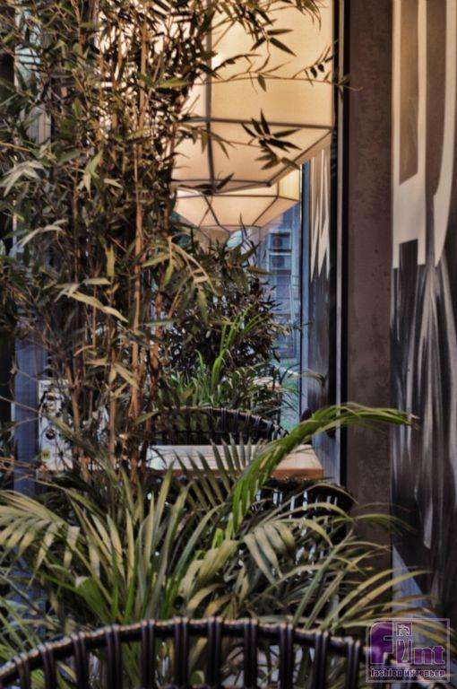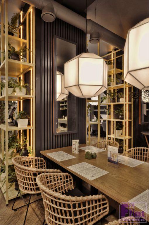 Обилие растительности, присущей тропическому азиатскому региону, традиционная плетёная мебель – это лишь тонкий намёк на незримое присутствие в интерьере ноток богатой азиатской культуры. Основной географический акцент, сотканный из невероятных и ярких вкусов и буйства красок, формируется у посетителей за столом в момент оригинальной подачи блюд с этническим колоритом. При этом, посадка в этом кафе одинаковая, поскольку логика проекта не требовала разноплановости в этом вопросе.