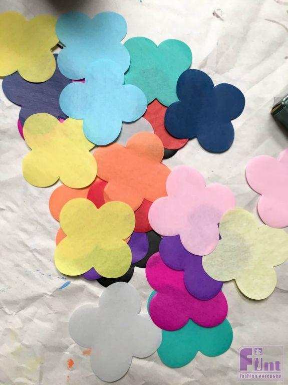 На следующем этапе нам необходимо подготовить красивые фрагменты из цветной папиросной бумаги. Мы сделали фрагменты в виде стилизованных цветов и многоугольников. Вы же можете подготовить фрагменты любой формы: от сердечек и до простых геометрических фигур (кружков, квадратов, треугольников и т.п.). Для вырезания фигур можно использовать шаблон и ножницы, или нарубить фигурки специальным приспособлением – фигурным компостером или дыроколом. Такие инструменты хорошо знакомы мастерам, увлекающимся скрапбукингом.