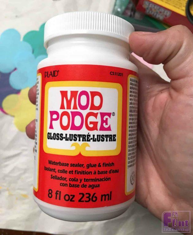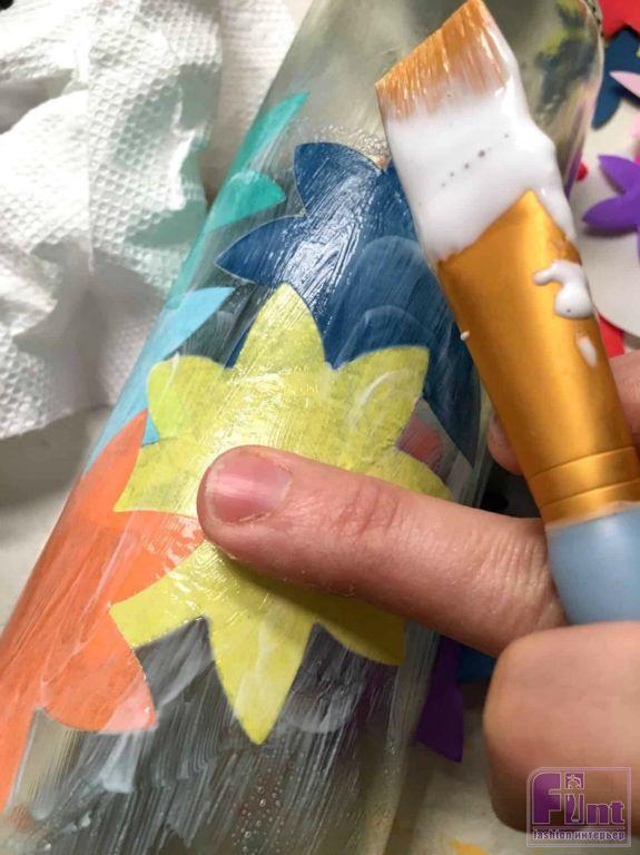 После того, Как все фрагменты будут наклеены на бутылку, дайте им высохнуть, а затем нанесите финишный слой клея-лака поверх всей «мозаики». Старайтесь наносить клей-лак аккуратно и деликатно, чтобы не сдвинуть приклеенные бумажные фрагменты, поскольку они очень тонкие. Предварительно, срежьте острым ножом фрагменты по нижнему краю бутылки.