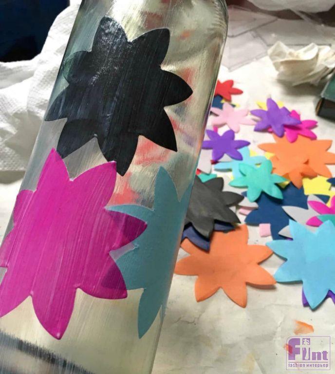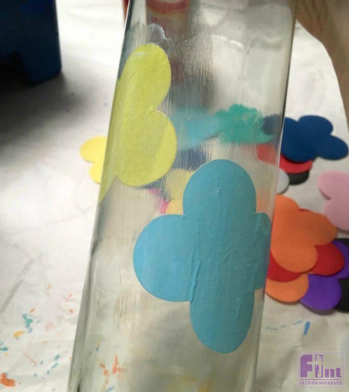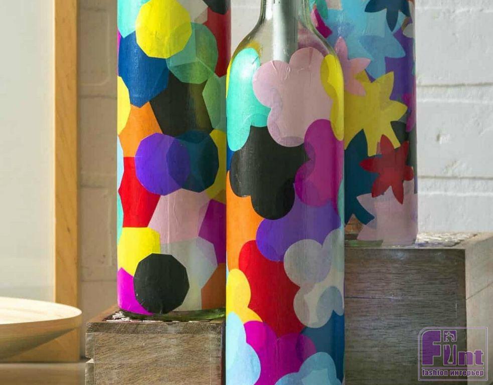 После того, как фигурки из цветной папиросной бумаги вырезаны в достаточном количестве, можно начинать клеить их на бутылки. Это очень легко сделать. Просто нанесите слой клея-лака для декупажа на бутылку и аккуратно приклеивайте фрагменты, выбирая интересные и красивые сочетания оттенков. Каждый наклеенный фрагмент покрывайте сверху ещё одним слоем клея-лака, чтобы поверх наклеенного фрагмента можно было нанести следующий фрагмент.