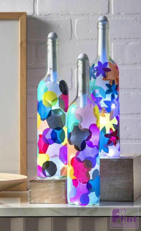 Мы смогли найти специальные гирлянды, которые идеально вставляются в горлышко бутылок, но вам вовсе не обязательно потребуются именно такие. Достаточно взять любые гирлянды на батарейках и закрепить их в бутылке, используя винные пробки или другие подходящие предметы. Нам очень понравились гирлянды с белыми светодиодами, но вы можете попробовать и другие цвета гирлянд, формируя волшебную игру света за счёт цветной папиросной бумаги и разных оттенков светодиодов.