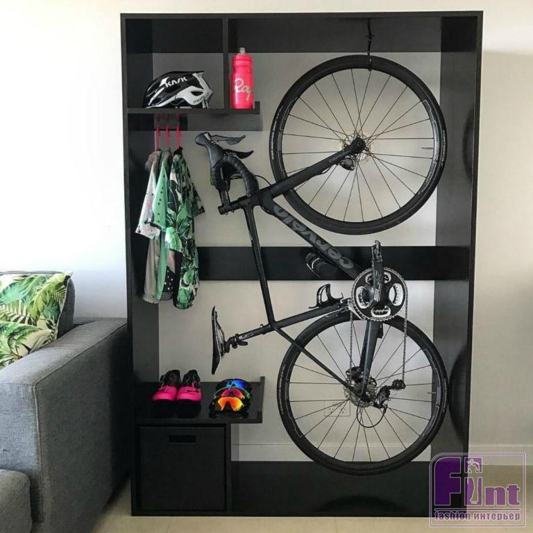 На лето шкаф в прихожей можно освободить от верхней одежды и использовать мебель для хранения велосипеда, конечно, если размеры шкафа позволяют это сделать. Зафиксировать велосипед внутри поможет стойка или крепежи. Есть и специальные стеллажи — в них необходимые элементы крепления уже предусмотрены.