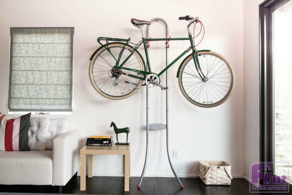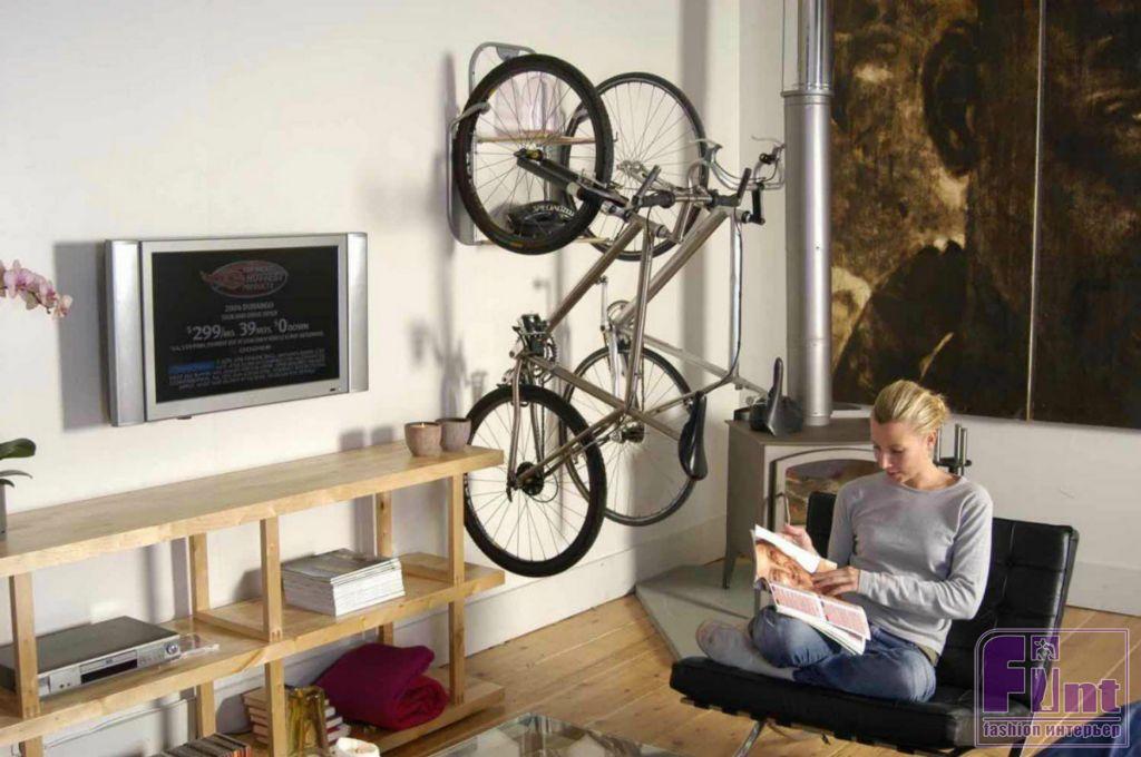 Таким способом велосипед удобно хранить на балконе, в прихожей или в кладовой. Смотрится не так эстетично, как при горизонтальном размещении, зато занимает меньше места. Вариант крепежа колёсами к стене лучше использовать, если установка планируется в углу. Иначе велосипед будет мешать. В любом случае – это один из самых компактных способов хранения, поскольку велосипед максимально занимает высоту помещения и минимально – его ширину и глубину.