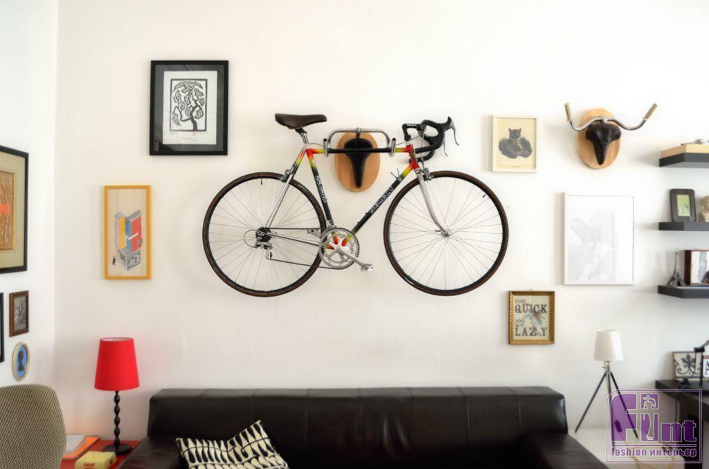 На стену велосипед крепится разными способами. Можно приобрести специальные крюки и кронштейны, а можно соорудить фиксатор из подручных средств. Например, из старого руля. Энтузиасты велосипеда придумали массу таких кронштейнов. Не отстают от них и дизайнеры.