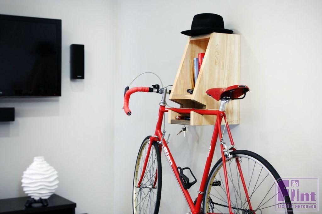 Это оригинальный способ горизонтального расположения, в котором крепёж маскируется под полку. Она может быть деревянной или металлической. Велосипед очень просто подвесить за раму или седло, а саму полку можно также использовать для разных мелочей. Естественно, такое крепление будет оправдано, если у вас просторная прихожая, где и велосипед будет «на месте», и полочка для мелочей пригодится.