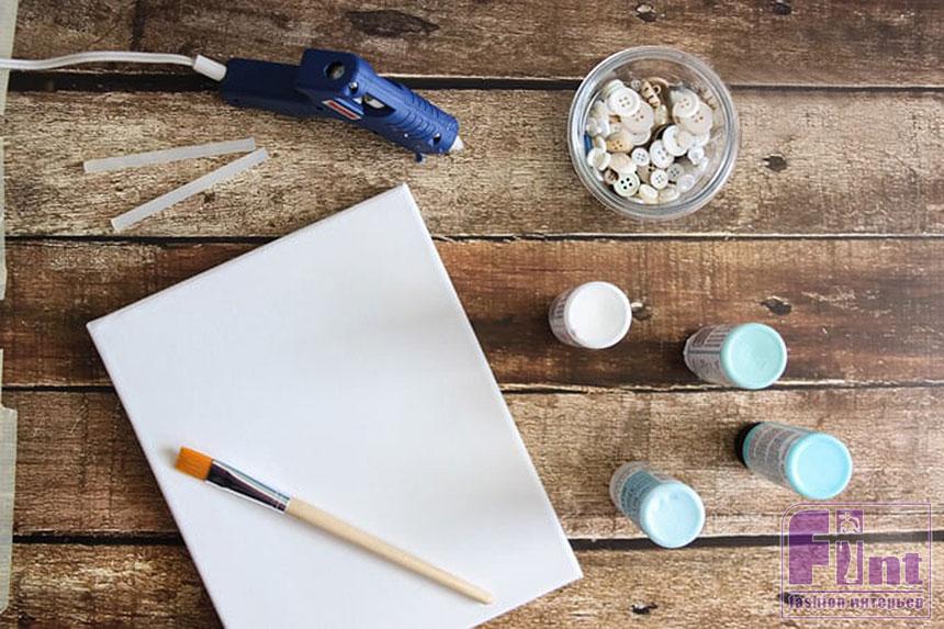 Такое настенное панно можно сделать очень быстро и просто. Для его изготовления нам почти не потребуется специальных знаний и навыков. Только немного аккуратности и усердия. Чтобы сделать такое панно, необходимо запастись небольшим грунтованным холстом на подрамнике (в нашем случае, 8×10 см.), акриловыми красками «морских» оттенков (белый, светло-голубой и бирюзовый), кисточкой, горячим клеевым пистолетом и несколькими десятками старых пуговиц в оттенках белого цвета, перламутровых и в более тёмных тонах (если вы планируете изобразить на панно узкую полоску пляжа).