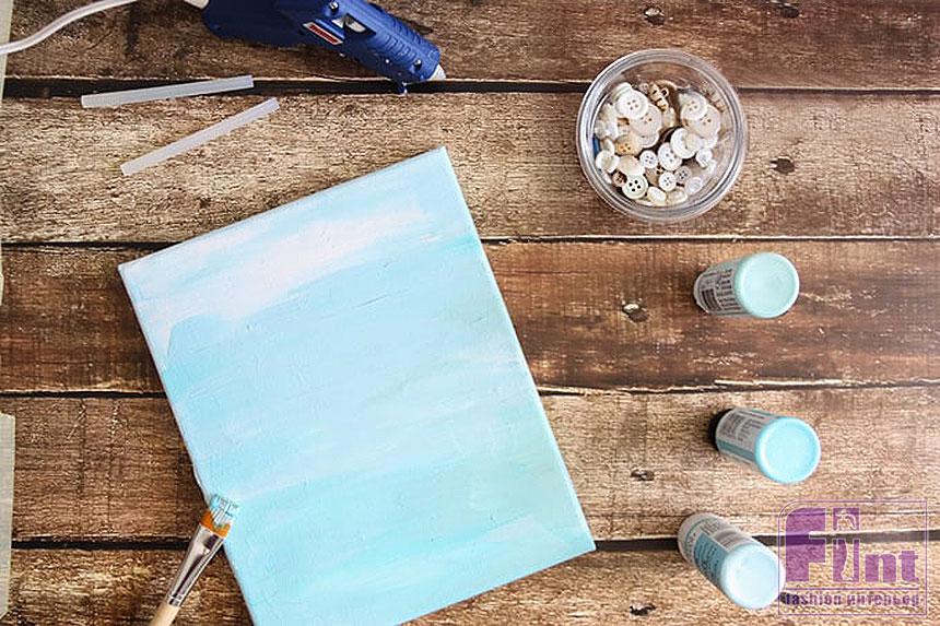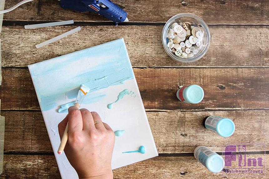 Начните с окрашивания холста на подрамнике. Нанесите на холст несколько мазков краски в оттенках синего или бирюзового цвета. Затем распределите нанесённую краску по поверхности холста с помощью кисточки. Если вы не хотите смешивать цвета и делать между ними плавные переходы, просто покрасьте холст в нежно-голубой или бирюзовый оттенок. Распределяйте краску по холсту горизонтальными движениями кисти, чтобы в и тоге получилась поверхность, напоминающая прибой. Не закрасить и боковые поверхности холста на подрамнике. Отложите проект в сторону, и дайте акриловой краске полностью высохнуть, прежде чем приступать к созданию «мозаичной картины» из пуговиц.