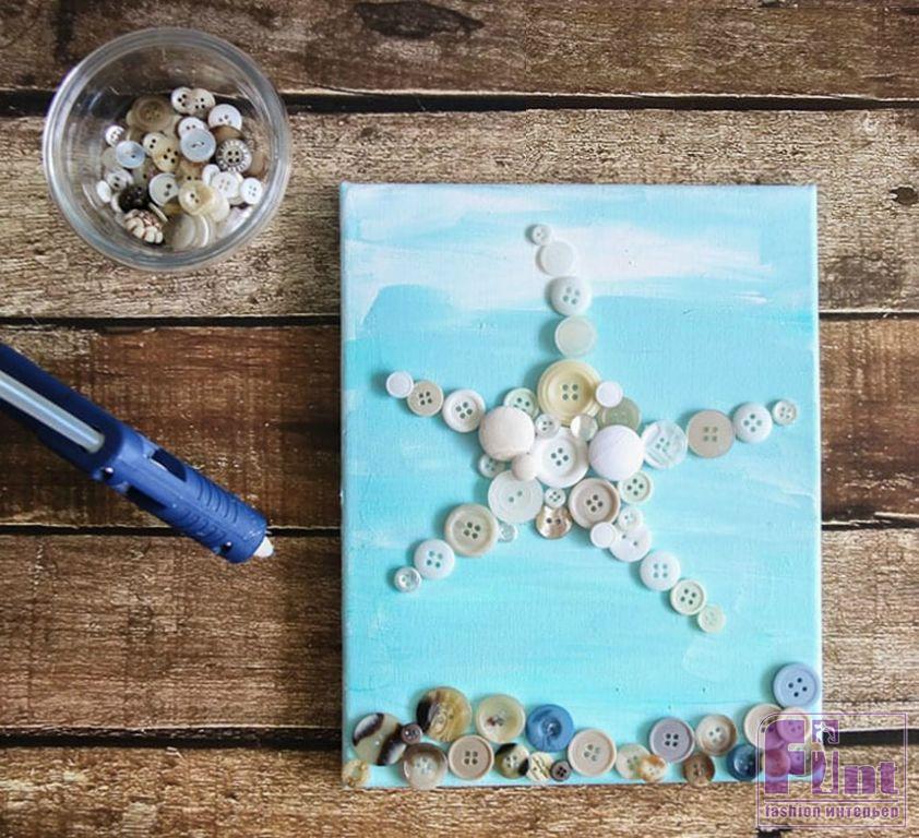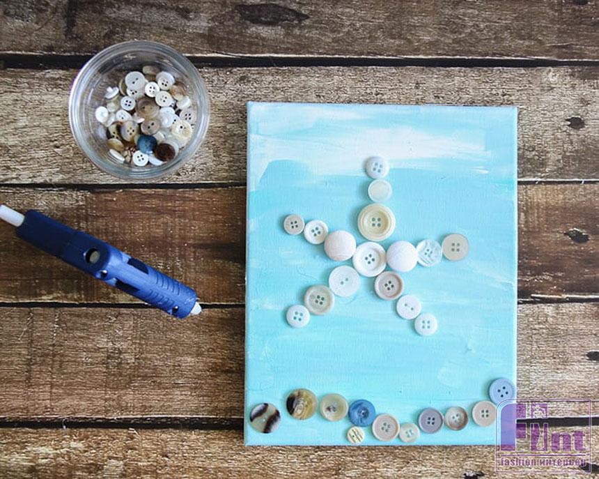 Затем можно приступать к созданию морской звезды из белых и перламутровых пуговиц. Начните с крупных пуговиц и расположите их в форме пятиконечной звезды. Форма не должна быть идеально симметричной. Не бойтесь, если лучи вашей звезды будут немного кривыми – в природе нет абсолютной симметрии. Используя горячий клей, закрепите пуговицы на холсте. Затем добавьте в фигуру звезды пуговицы меньшего размера, чтобы придать фигуре классическую форму морской звезды.