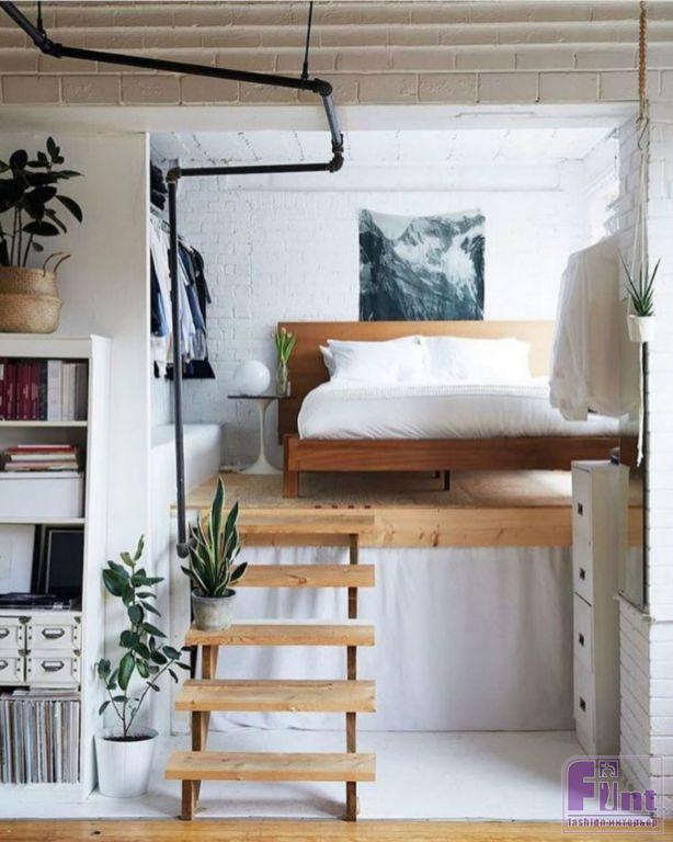Спальня в нише — довольно спорное решение, связанное с возможным неудобством использования кровати. Но в «однушках» часто приходится делать выбор — или полноценное место для сна, или больше свободного пространства. И, конечно, многие выбирают первый вариант, так как без удобной кровати сложно представить комфортную жизнь. Например, в этой «однушке» по проекту дизайнера Аллы Кущевой присоединили пространство гардеробной в коридоре к комнате, чтобы найти место и для гостиной зоны, и для спальни. Последнюю организовали в нише на подиуме за раздвижными дверьми.