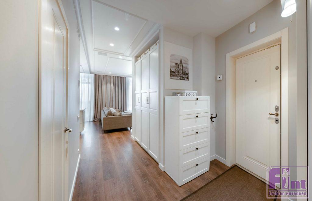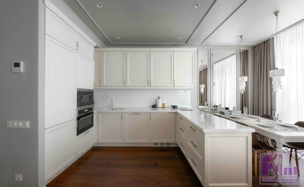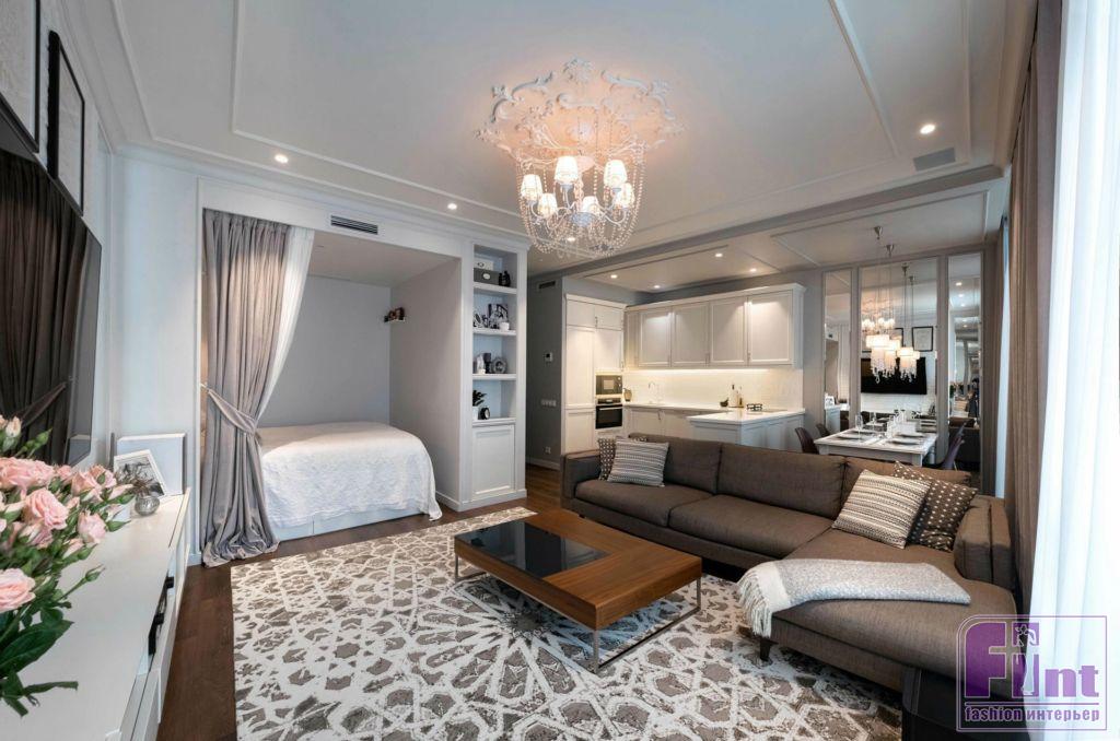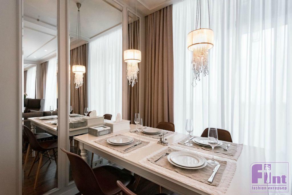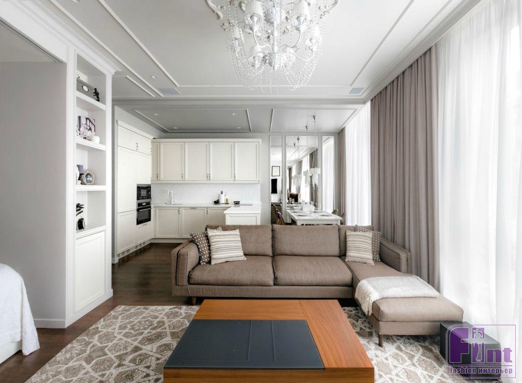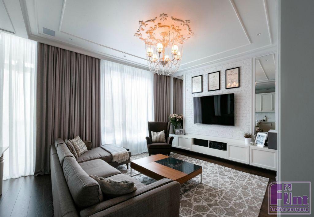 Основная «фишка» этого проекта, по словам дизайнера, – наличие многофункциональных ниш, которые позволяют задействовать каждый сантиметр площади, а также дают жилищу некую визуальную динамику. Классические мотивы прослеживаются в очертании дверей и в гипсовой лепнине, которая изготовлена по индивидуальному проекту.