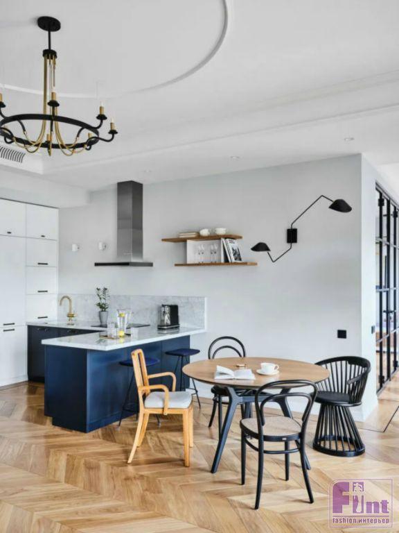 После соединения трех квартир была сделана полная перепланировка, архитекторы выбрали анфиладную. Она отличается тем, что комнаты расположены смежно относительно друг друга, а проемы дверные находятся по одной оси. Такая планировка делает помещение визуально просторнее и светлее. Площадь квартиры Александра Рогова составляет 130 кв.метров. Центральной частью является совмещенная зона кухни и гостиной.