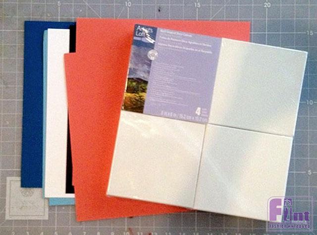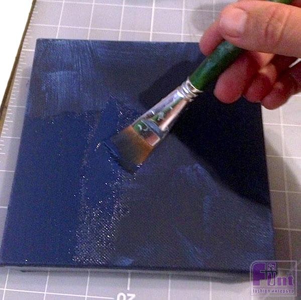 Поскольку мы будем делать сразу 4 панно, чтобы создать из них красивую композицию на стене, для начала нужно подготовить наши холсты на подрамниках. Определитесь с цветов, или используйте нашу цветовую гамму. Мы окрасили первый холст в белый цвет, второй – в насыщенный сине-лазурный и два оставшихся – в небесно-голубой цвет. Оставьте холсты до полного высыхания и приступайте к подготовке трафаретов.
