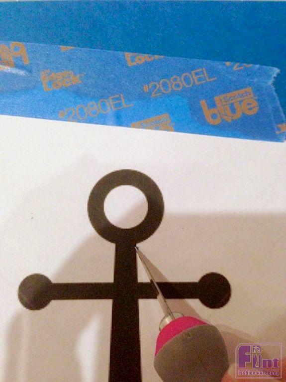 Для нанесения трафаретных рисунков мы выбрали 4 классических «морских» рисунка в стилизованном виде. Это сигнальный флажок от морской флажковой азбуки, старинный морской штурвал, классический якорь и не менее классический спасательный круг. Если вы не можете нарисовать эти предметы, просто найдите шаблоны подходящего размера в интернете и распечатайте их. Затем, используя узкий малярный скотч, прикрепите шаблоны к листам плотной цветной бумаги для творчества и при помощи ножниц и ножа вырежьте по шаблонам изображения выбранных морских аксессуаров. Флажок мы сделали сине-красным, якорь – синим, штурвал тёмно-синим, а спасательный круг – традиционно белым, с красными лентами.