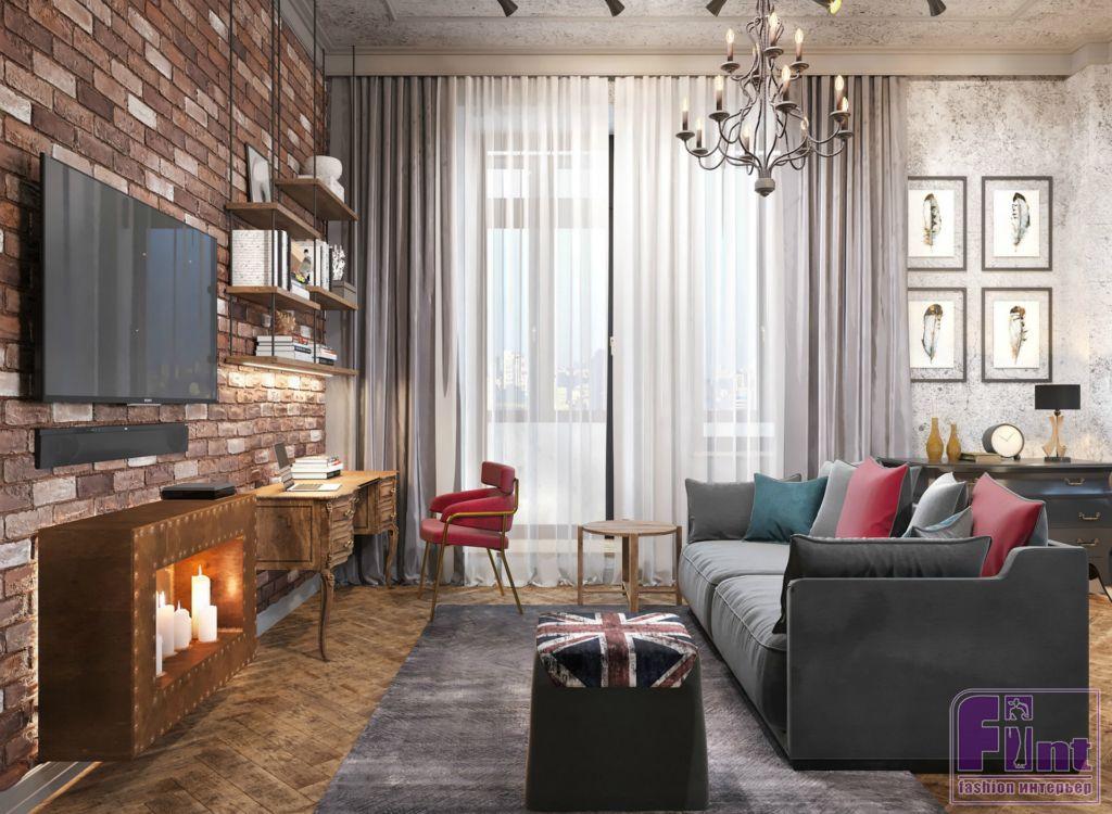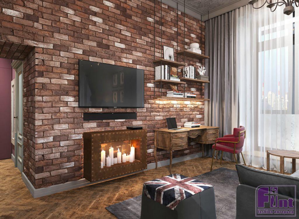 Телевизор и современная аудиосистема расположены на стене напротив дивана, над декоративным камином с приглушенной подсветкой. Справа от ТВ-зоны разместился своеобразный кабинет – здесь стоит фигурное кресло и антикварный рабочий стол, а над ним висят «лофтовые» полки для книг. В плане отделки в гостиной применялся гипсовый кирпич, микроцемент («лофтовый бетон») и зеркально-патинированное оформление.