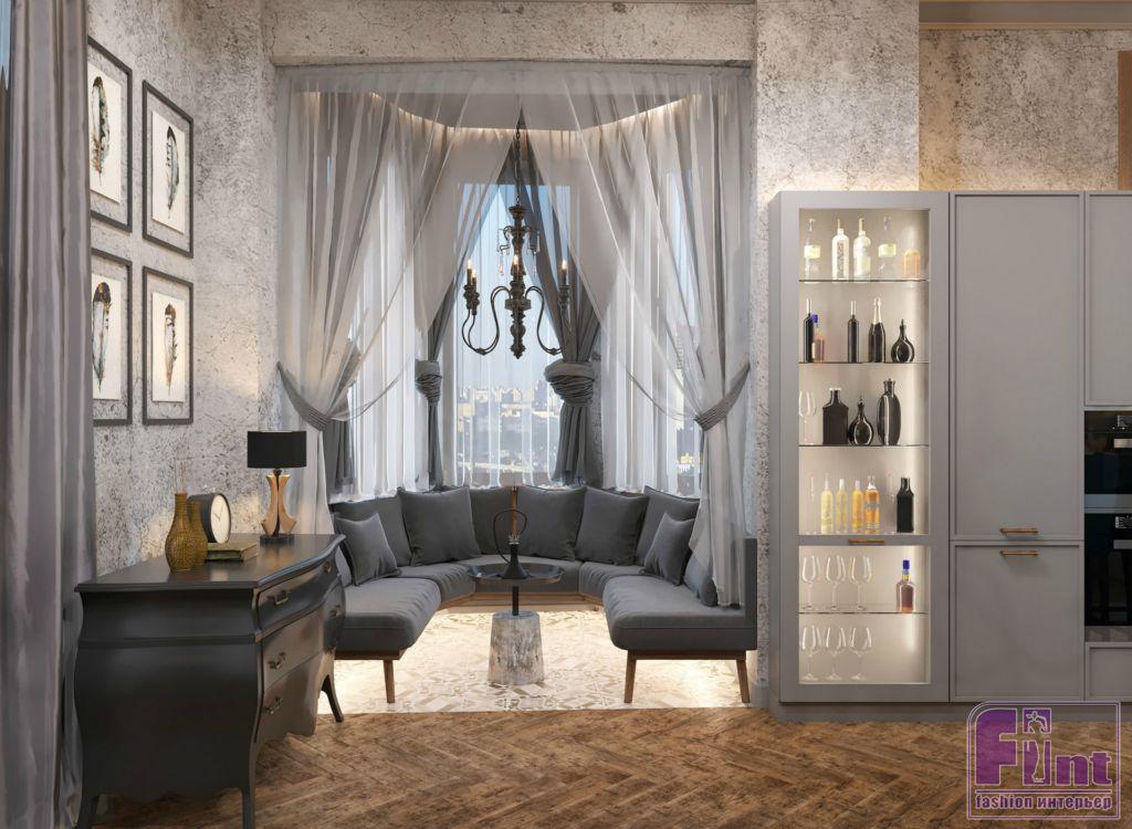Кальянная, расположенная в эркере, визуально отделена от гостиной полупрозрачной портьерой, что даёт ощущение приватности. На полу в целях безопасности уложена керамическая плитка в стиле пэчворк. В центральной зоне помещения расположена мягкая мебель – диван и необычный пуф с обивкой в виде британского флага. Рядом стоит лаконичный кофейный столик.