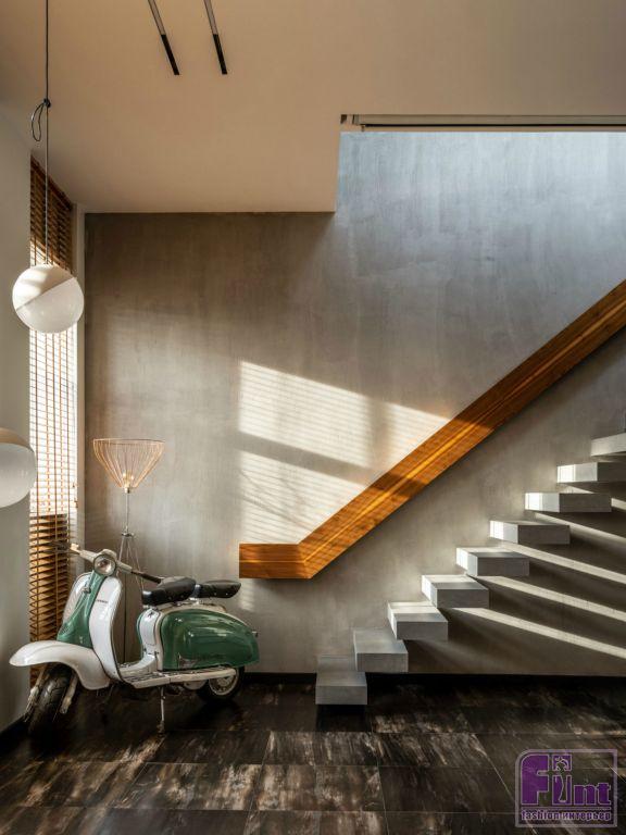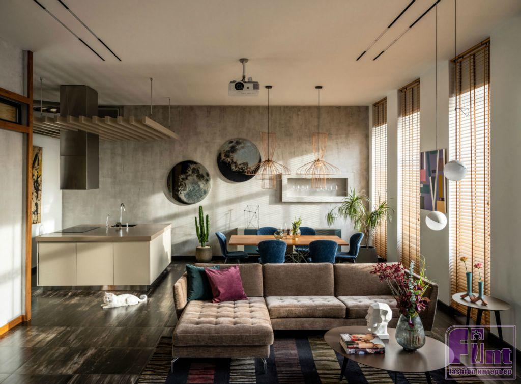 «На первом этаже находится самая большая комната — гостиная, совмещённая с кухней и обеденной зоной. Здесь нет стен, и это сделано специально, чтобы устраивать вечеринки и весёлые мероприятия», — поделился Влад. Большой интерес гостей всегда вызывает раритетный мопед 1960 года выпуска итальянской фирмы Lambretta – главного соперника не менее культовой Vespa. Этот мопед 60-х годов стилист приобрёл на одном европейском аукционе. На стене нашлось место для огромного экрана, на котором Лисовец любит смотреть кино с друзьями через проектор.