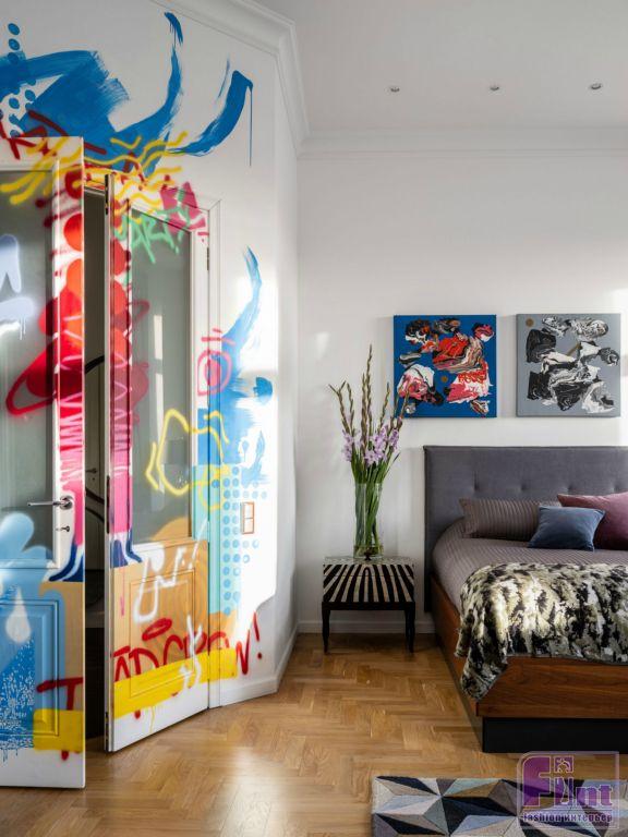 А вот гостевая спальня — это чуть ли не самое яркое место в доме. Лисовец специально пригласил художника из Санкт-Петербурга, который разукрасил стены граффити. Здесь также нашлось место и для нескольких картин в жанре современного искусства.