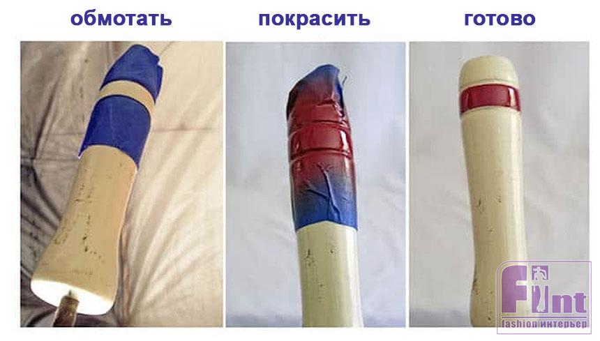 По дизайнерскому замыслу нам необходимо, чтобы ручки и сама подставка имели винтажный вид. Поэтому, мы окрасили части скалок белой краской, а после её высыхания немного обработали скалки мелкозернистой наждачной бумагой, создав имитацию потёртостей от времени. Затем, используя малярный скотч, разметьте на ручках скалок полоски, и, используя красную краску, создайте узор на ручках скалок. Этой же красной краской покройте две половинки плашки.