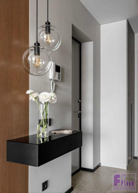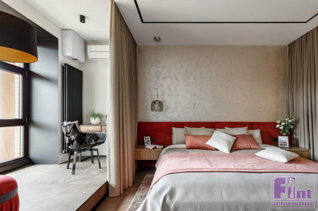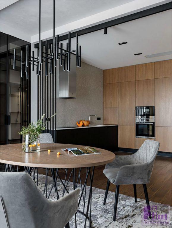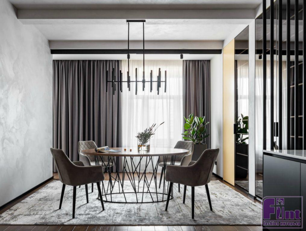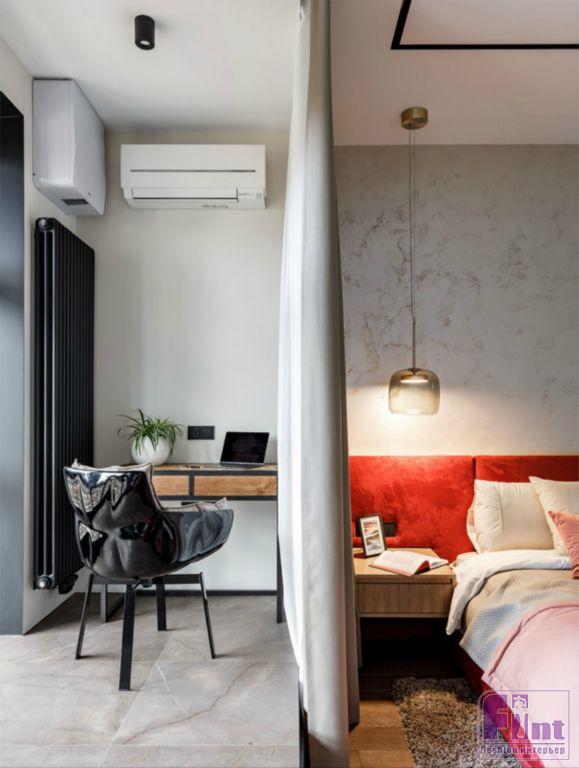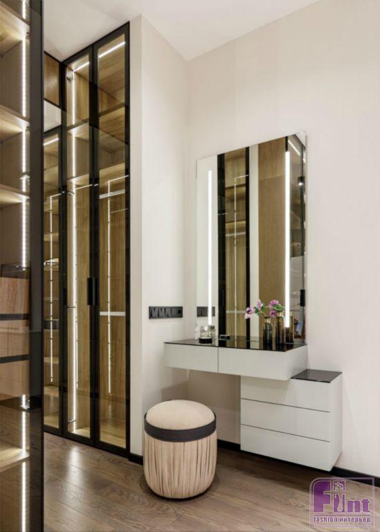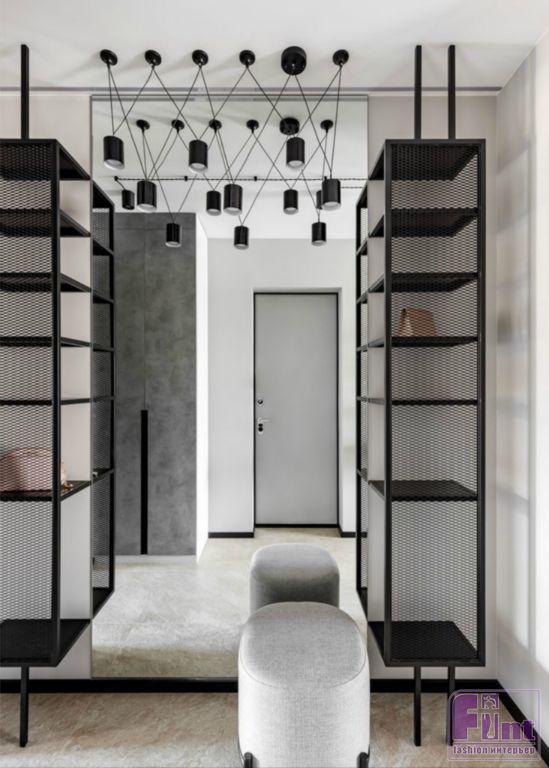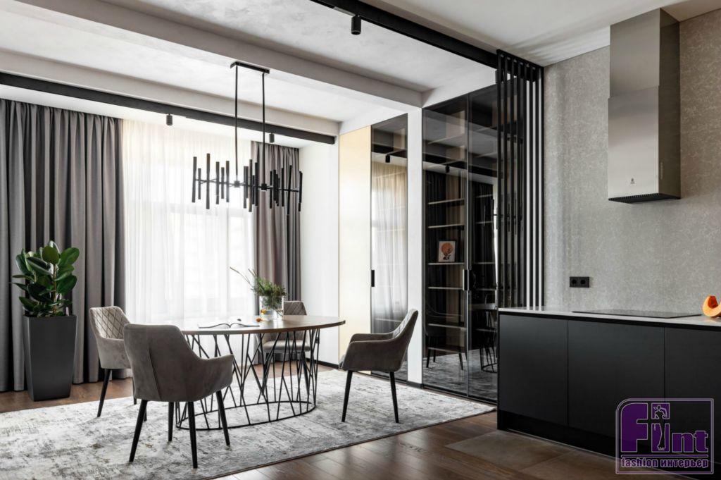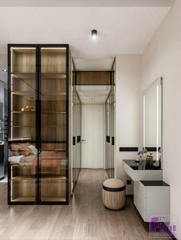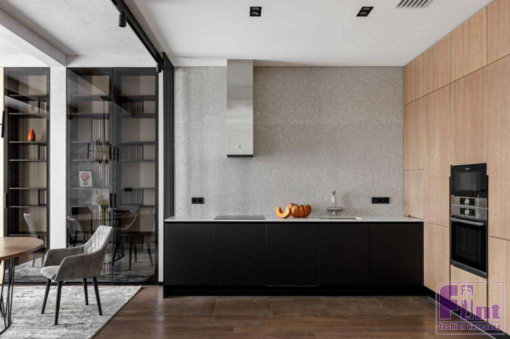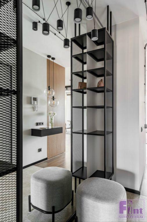 Фактура дерева и бетонный серый цвет в кухонной зоне задают тон дизайну всей квартиры. Общее пространство гостиной и кухни разделяет функциональная перегородка, выполненная по канонам стиля лофт, а минимализм хозяйской спальной комнаты гармонично дополняют холодные оттенки этого брутального стиля. Дополнительный простор интерьеру придают стеклянные и зеркальные элементы, размещённые дизайнерами в зоне прихожей. Необычный стеллаж с фасадом из тонированного стекла и вместительные системы хранения с зеркальными панелями помогают добавить пространства в условиях его фактического дефицита.