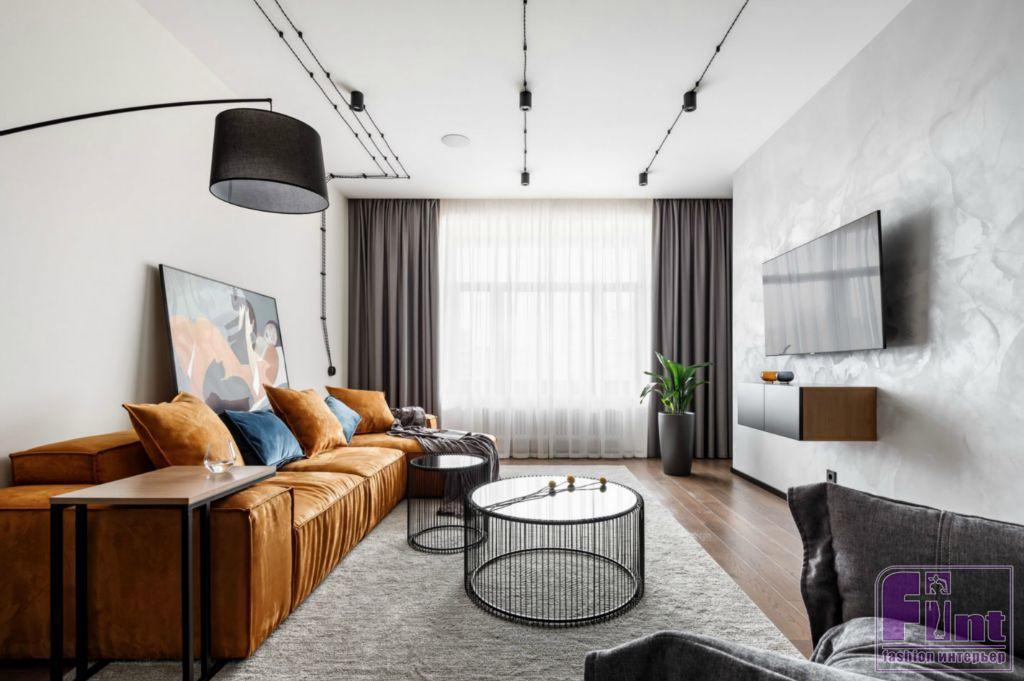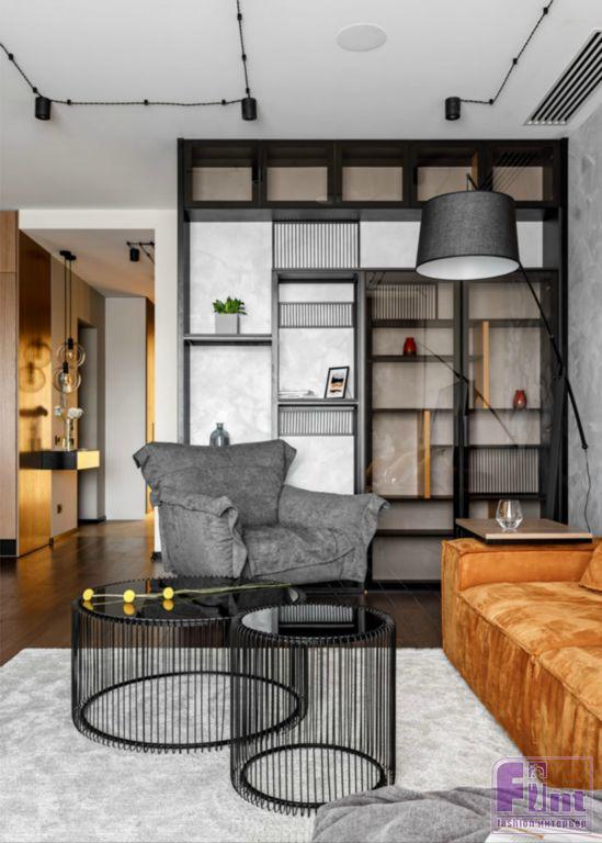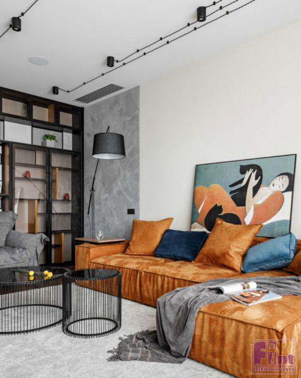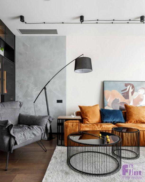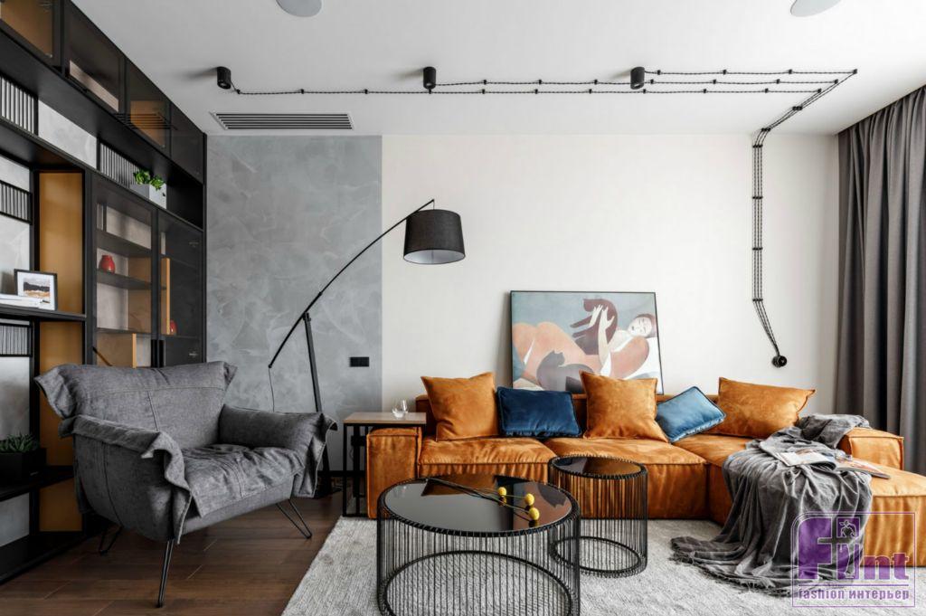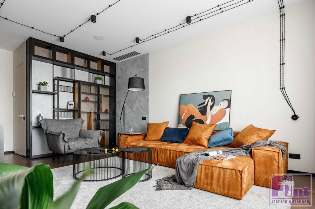 Яркий цвет дивана оживляют гостиную и задаёт настроение всему помещению. Использованная во всём проекте открытая внешняя электрическая проводка дополняет стиль этого пространства, сообщая ему необходимую нотку индустриальности, характерную для стиля лофт. Также на стиль лофт активно работает необычная мебель. Тонкие чёрные линии шкафов и светильников в явном виде отсылают к стилю минимализм, растворяясь в окружающем лофте.