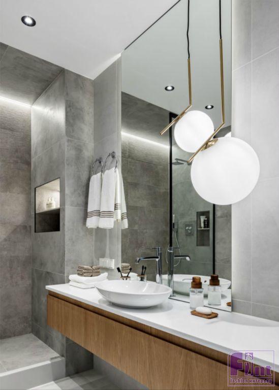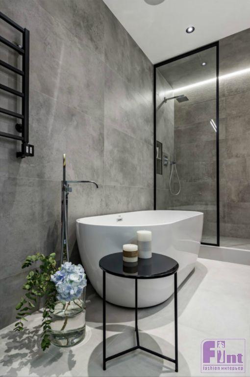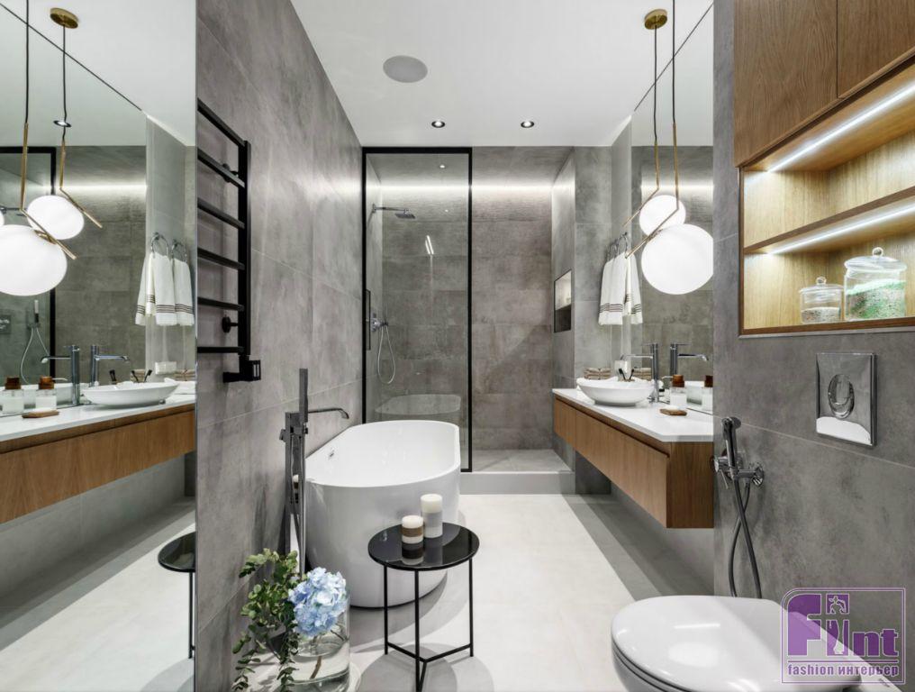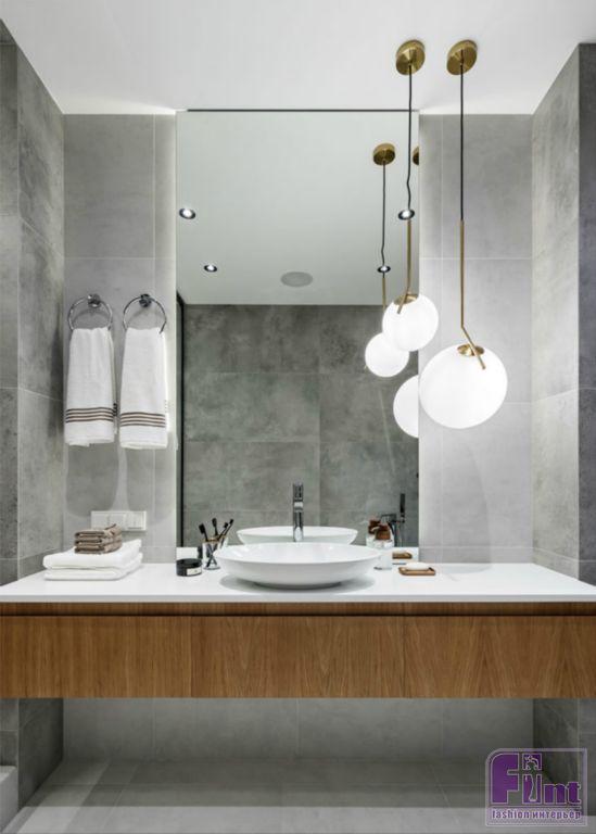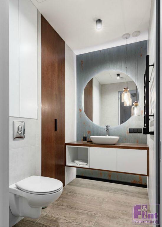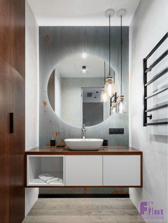 В ванной обыграны фактуры дерева и бетона. Визуально расширить пространство помогают большие зеркала, установленные на противоположных стенах санузла, и стеклянная перегородка в зоне душевой. Особое внимание дизайнер уделила освещению, которое присутствует, как в традиционном, так и в локальном формате.