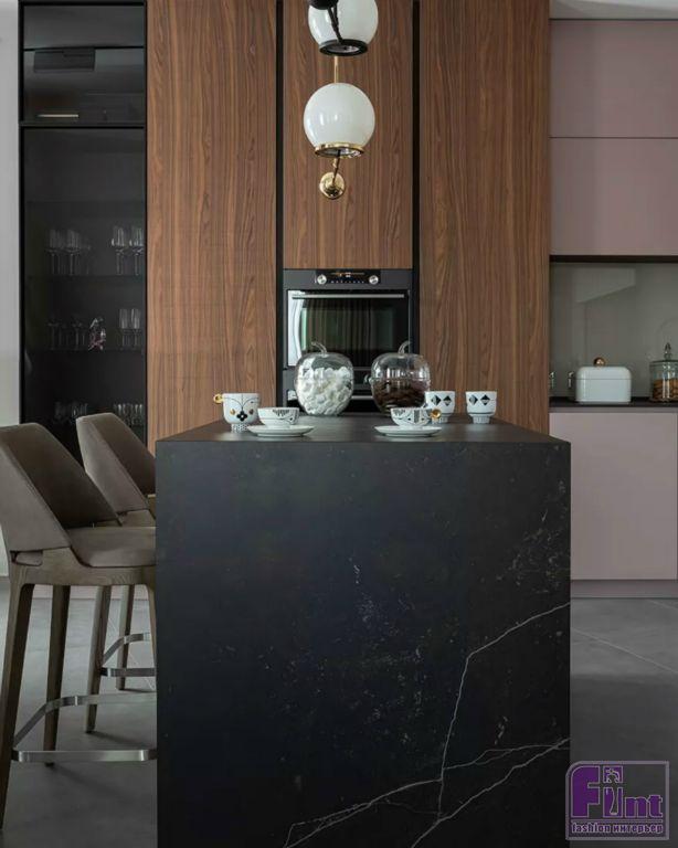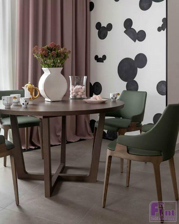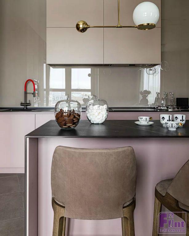 В квартире изначально были заложены грамотные инженерные коммуникации, например, встроенные конвекторы. Также несомненным достоинством исходного пространства стали панорамные окна «в пол». А вот запроектированную вентиляцию пришлось переделывать, так как авторы хотели объединить спальню с гардеробной и гостиную с кухней. Интересным акцентом гостевого пространства стала стена с декоративной штукатуркой, оформленной контрастным трафаретным орнаментом со стилизованными изображениями головы диснеевского «Микки-Мауса».