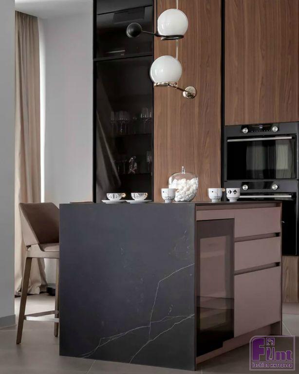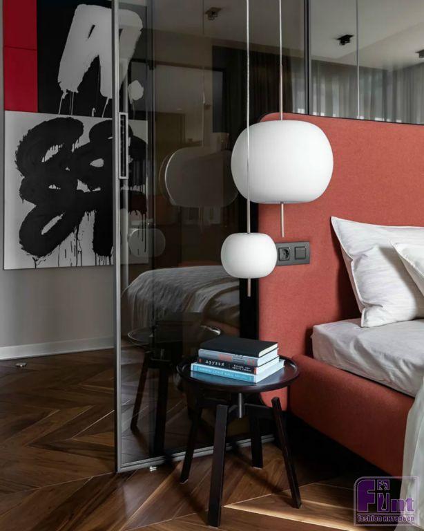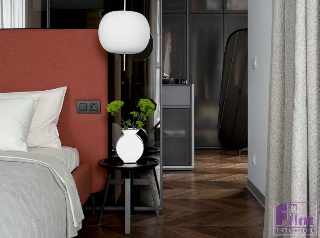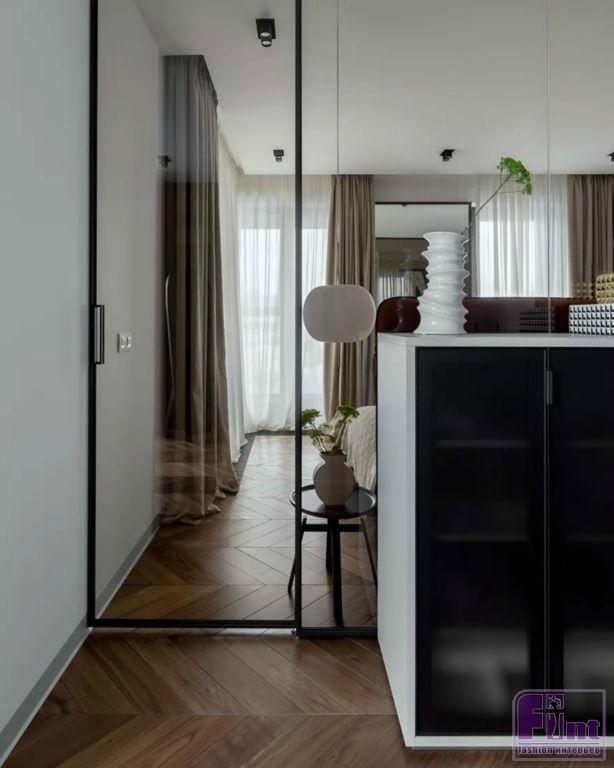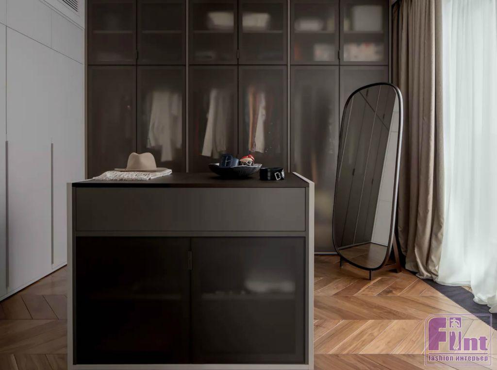 Большая общая площадь квартиры позволила дизайнерам не экономить на пространстве, создавая необходимые для комфортной жизни помещения. Так рядом с хозяйской спальней, в приватной зоне квартиры, дизайнеры предусмотрели просторную гардеробную комнату, оформленную стильными системами хранения с фасадами из тонированного стекла.