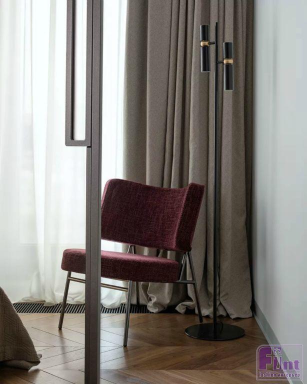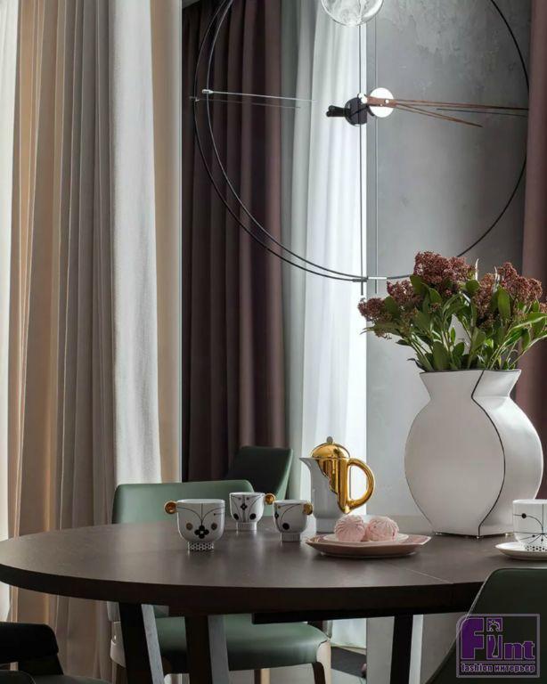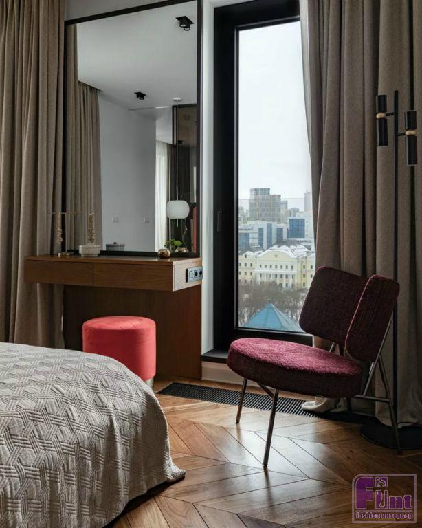 Панорамные окна «в пол» были деликатно обыграны дизайнерами с помощью текстиля, который не только не скрывает преимущества больших окон, но и подчёркивает их, одновременно сохраняя визуальную высоту квартиры. Добиться этого эффекта дизайнерам удалось за счёт использования скрытых карнизов, благодаря которым шторы буквально струятся из плоскости потолка.