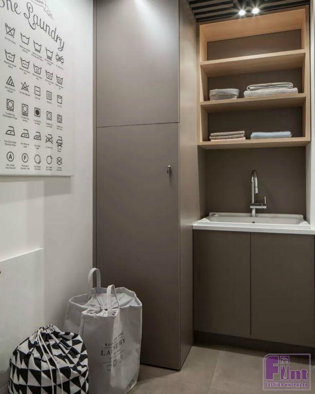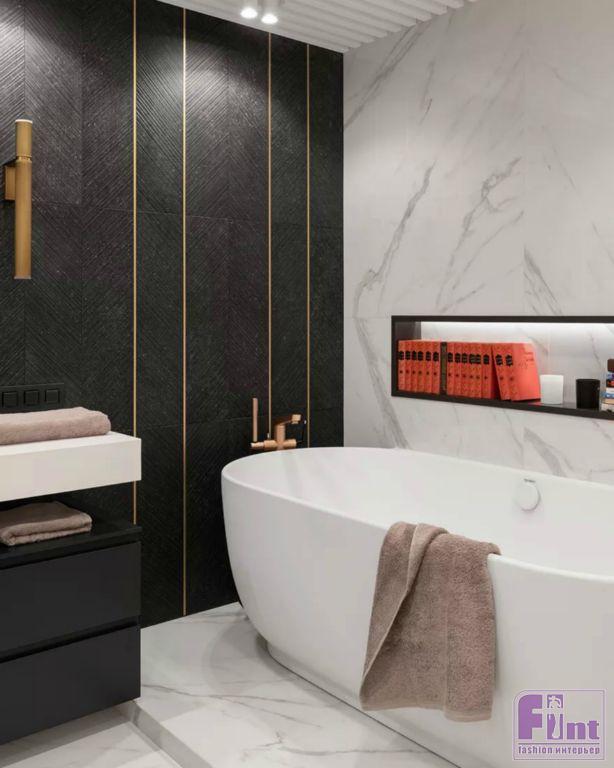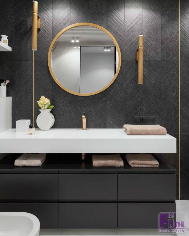 В проекте предусмотрено несколько санузлов, а ванная комната разделена с душевой. Светлый керамогранит в ванной комнате отлично гармонирует с тёмной мебелью и настенной плиткой в цвете венге с орнаментом французской ёлочки. Этот орнамент можно также заметить во многих комнатах квартиры на полу, поскольку паркет уложен именно в орнаменте «шеврон» (chevron).