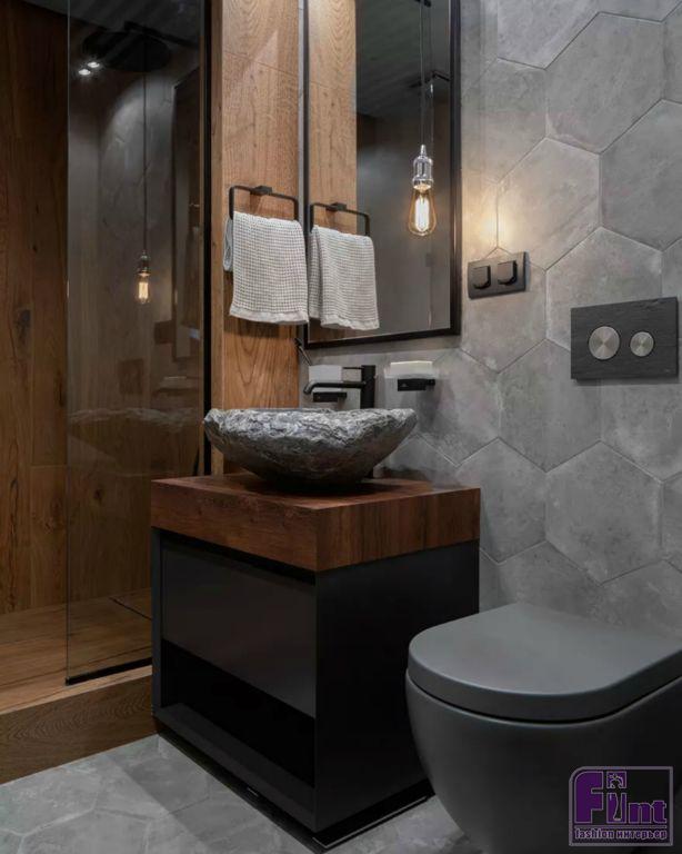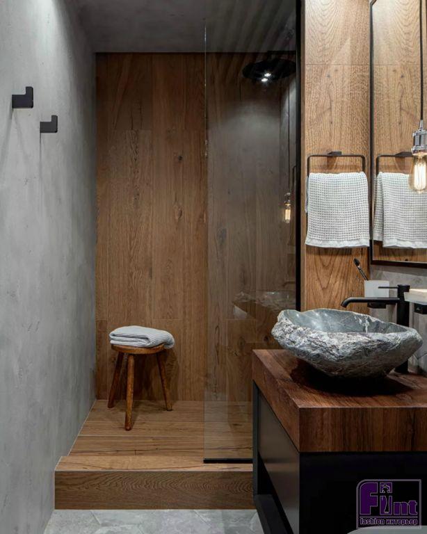 Душевая выполнена с акцентом на два основных материала и два базовых цвета: бетон и натуральное дерево. В отличие от кранов и фурнитуры золотого цвета в ванной, в душевой сантехнические элементы имеют глубоко матовый графитовый оттенок, отлично сочетающийся с фактурой бетона. В душевой дизайнеры установили очень необычную раковину из цельного куска камня, которая прекрасно дополняет сдержанный и лаконичный дизайн душевой.