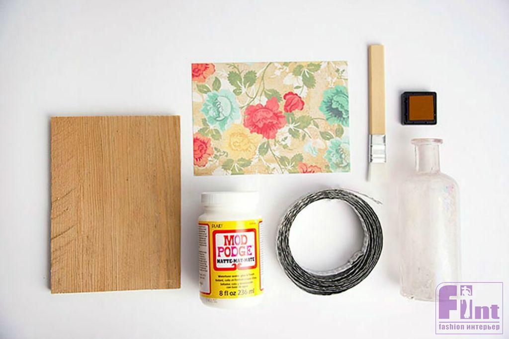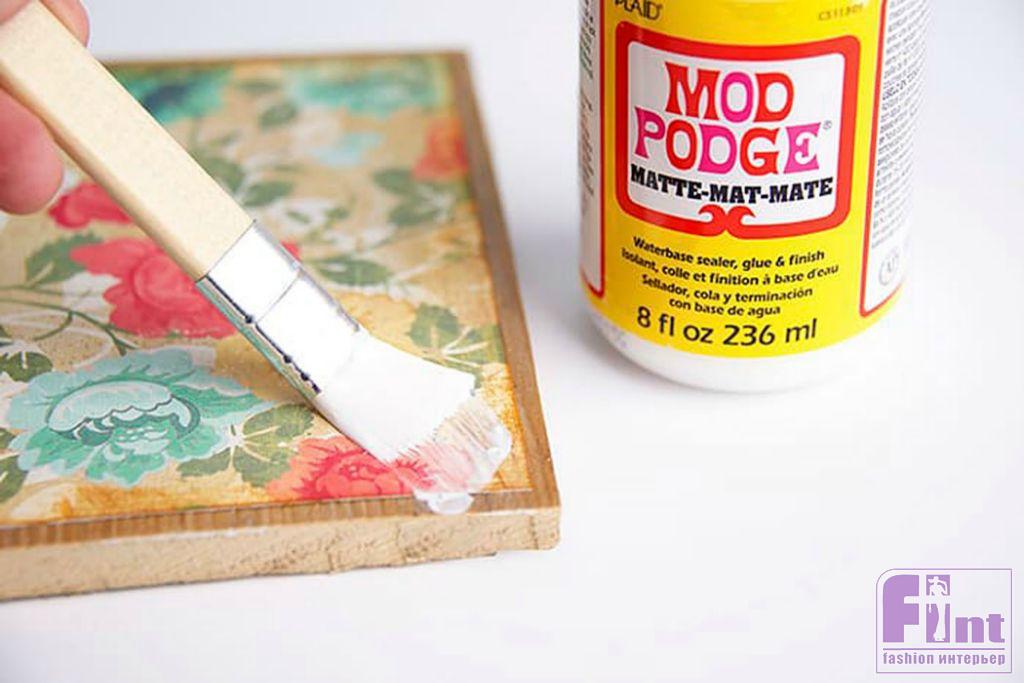 Затем нанесите клей-лак для декупажа на деревянную основу и бумагу и склейте их вместе. После высыхания нанесите дополнительный слой поверх всей лицевой части изделия. Если вы планируете повесить свою вазу снаружи вашего дома, добавьте ещё пару дополнительных слоёв клей-лака, после высыхания первого слоя.