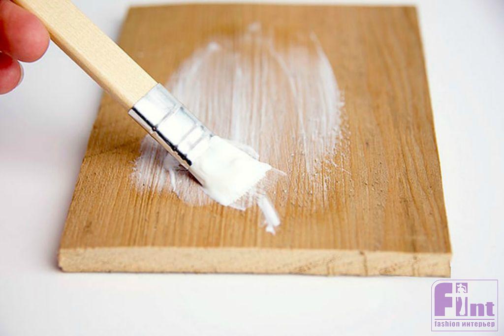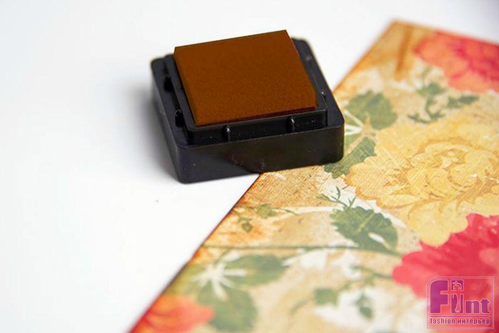 Для начала обрежьте вашу дощечку или отрезок фанеры до необходимых размеров. Мы решили, что наше панно будет иметь размеры 15×20 см. Затем вырежьте из бумаги прямоугольник с размерами чуть меньше деревянной основы (примерно 13×18 см), чтобы по краям осталось около 1 см свободного пространства. Обработайте края бумаги коричневыми чернилами, затерев их штемпельной подушечкой, или же воспользуйтесь обычной гуашью и кисточкой. Такое декорирование придаст бумаге состаренный винтажный вид.