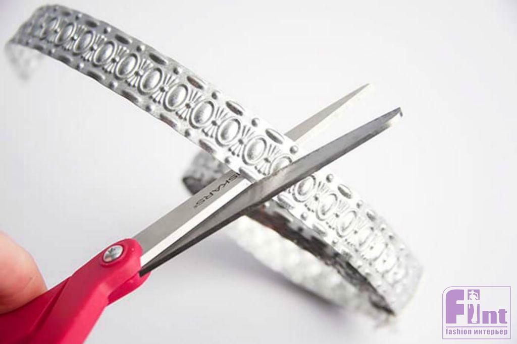 После того как клей-лак высохнет, расположите стеклянную бутылку по центру заготовки и измерьте, какой кусочек металлической ленты вам потребуется. Наша металлическая обделка легко режется обычными ножницами. Если у Вас более толстая лента, вам дополнительно могут потребоваться кусачки и плоскогубцы для отрезания ленты необходимой длины и придания ей формы.