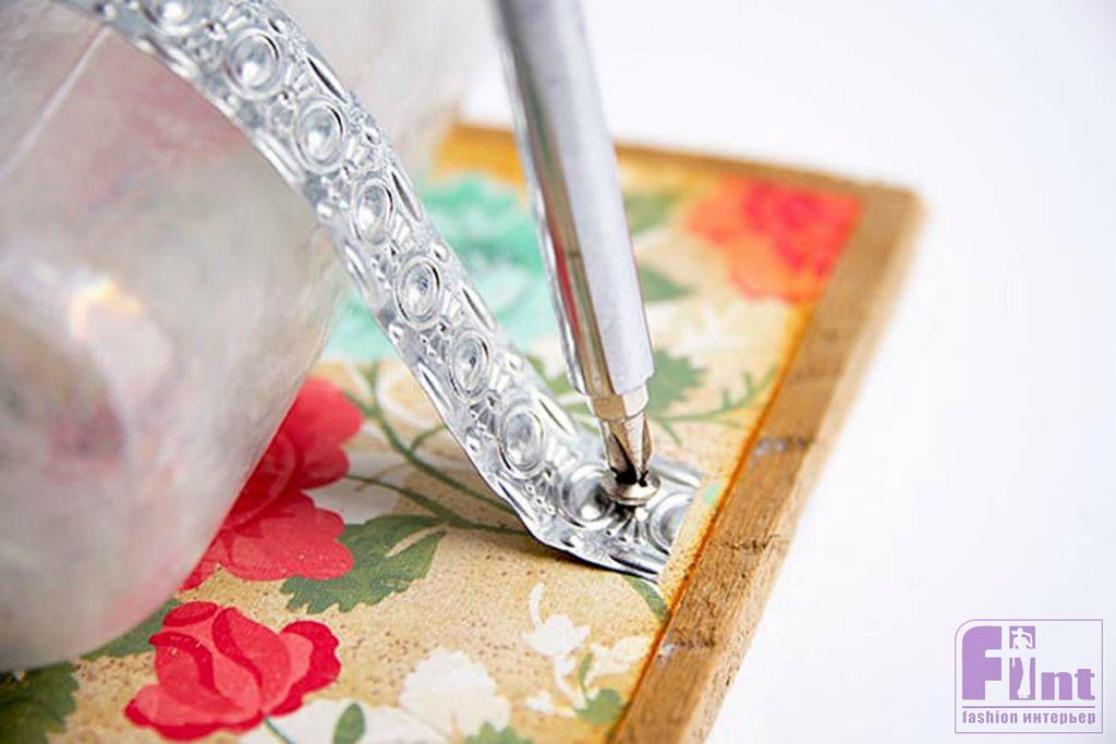 Если вы не можете найти у себя в хозяйстве старую бутылку, присмотритесь к бутылкам в отделе «посуда» в любом крупном магазине – наверняка среди огромного разнообразия кухонных бутылок найдётся подходящий и недорогой экземпляр. Металлическую ленту-раскладку можно приобрести в магазине DIY. Обычно такие аксессуары предлагаются в отделе мебельной фурнитуры.