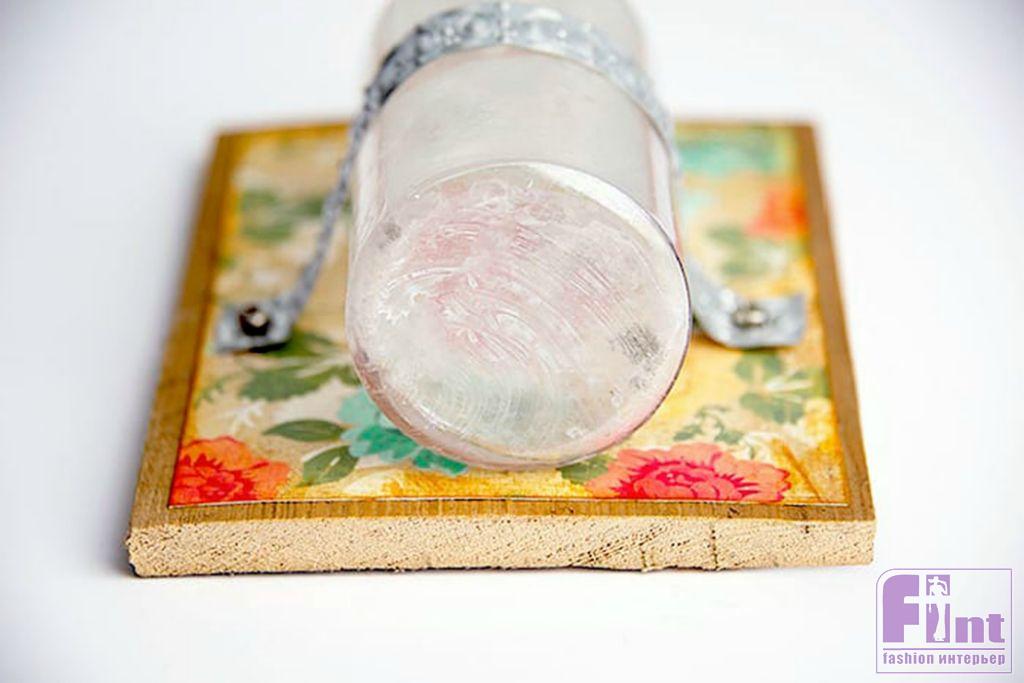 С помощью отвёртки и двух шурупов саморезов прикрепите бутылку к основе, тщательно натянув металлическую полоску. Убедитесь, что сила натяжения достаточная, чтобы ваша бутылка не выскользнула из крепежа. Если вы опасаетесь, что со временем бутылка может выпасть, просто добавьте немного клея-лака на заднюю часть бутылки перед прикручиванием импровизированного «хомута».