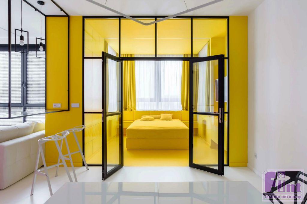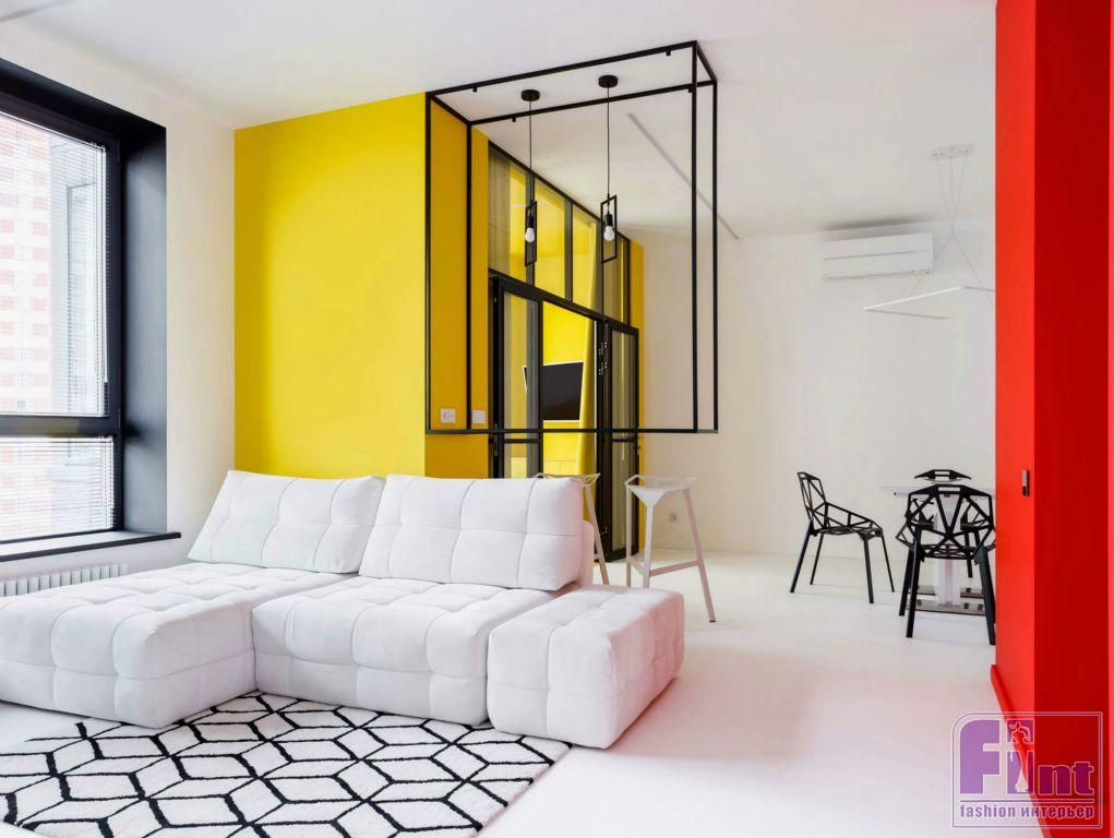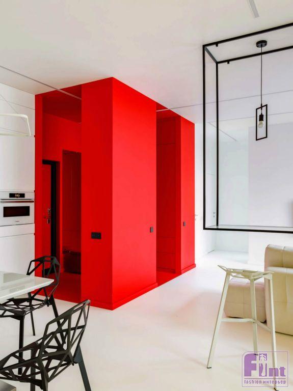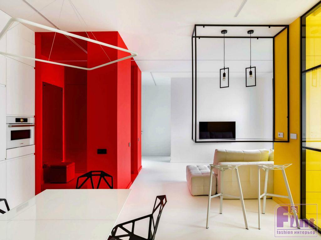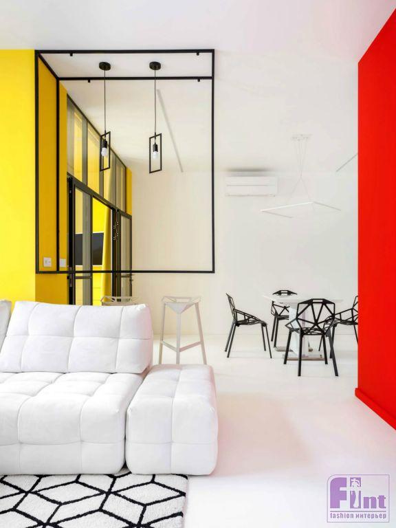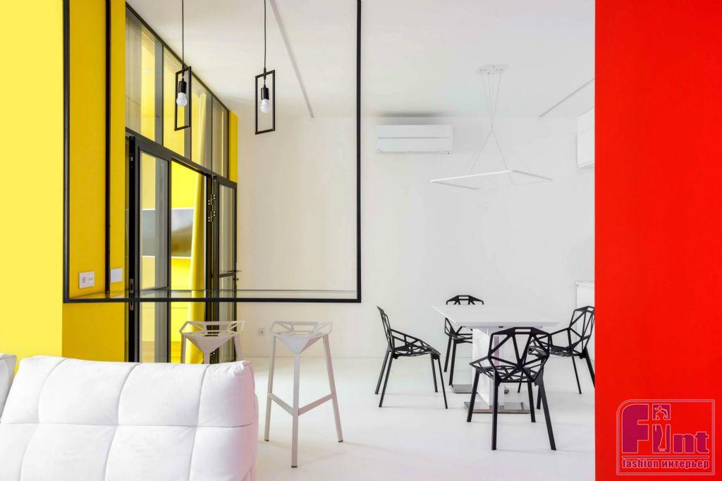Зона open space с видом на подвесную барную стойку оформлена в преобладающем белом цвете с двумя яркими акцентами смежных помещений. С одной стороны — отделённая стеклянной дверью спальня в жёлтом цвете, с противоположной стороны — ярко-красный акцент прихожей.