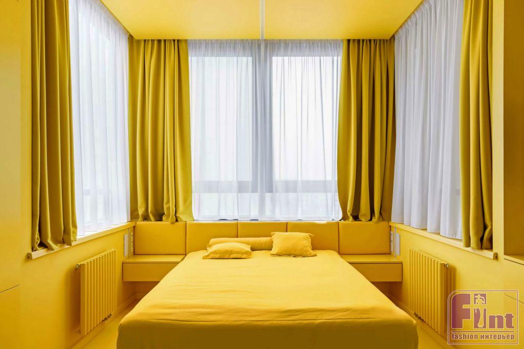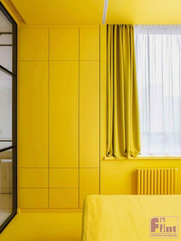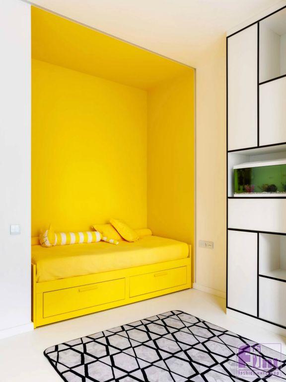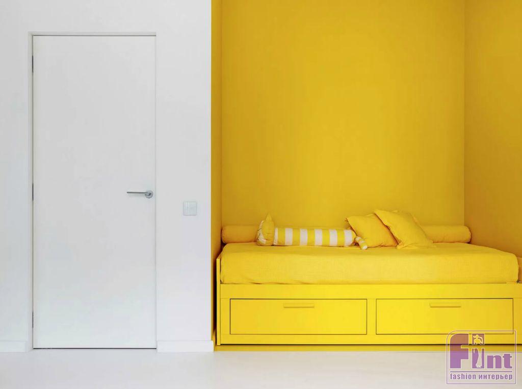 «Зона сна выделена жёлтым цветом, непривычным для приватных помещений, но, учитывая облачную и серую московскую погоду, такое решение добавляет энергии и настроения. По аналогии со спальней в изолированной детской комнате в тот же самый цвет выкрашена зона, где установлена кровать», — рассказывает архитектор. В родительской спальне нет других оттенков, за исключением жёлтого: постельное бельё, шторы, радиаторы отопления и даже пол. Ниша с детской кроватью по цвету перекликается с родительской спальней, поскольку всё в ней, включая декоративные подушки, оформлено в аналогичном жёлтом цвете.