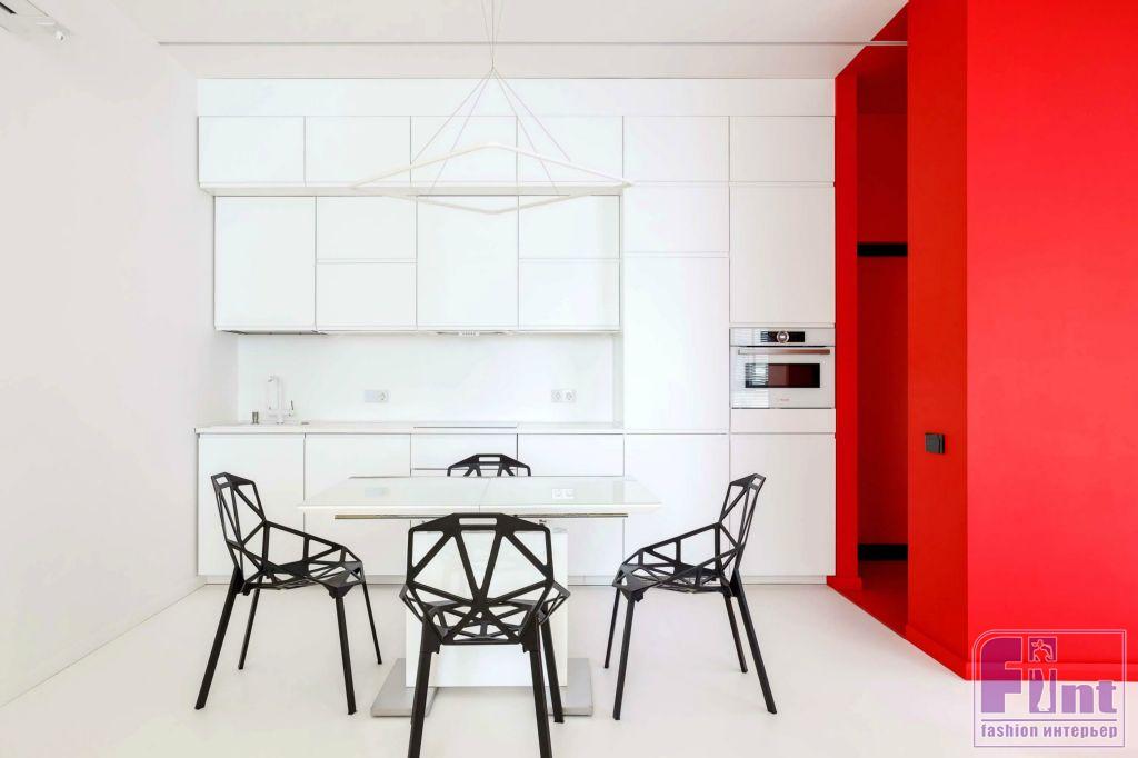 Обеденная и гостиная зона в квартире образуют одно помещение, отделка и мебель которого решены в монохромном варианте с использованием чистого белого цвета и контрастных элементов. Графичности интерьеру добавили тонкие черные линии подвесной барной стойки, стулья в обеденной зоне и ковёр.