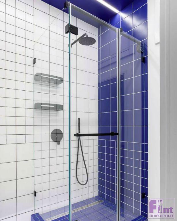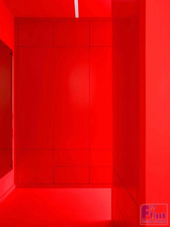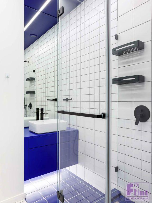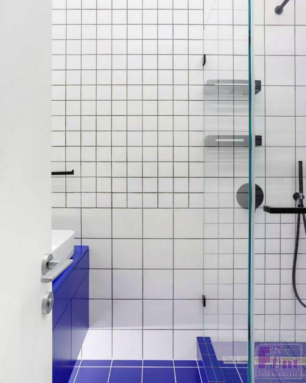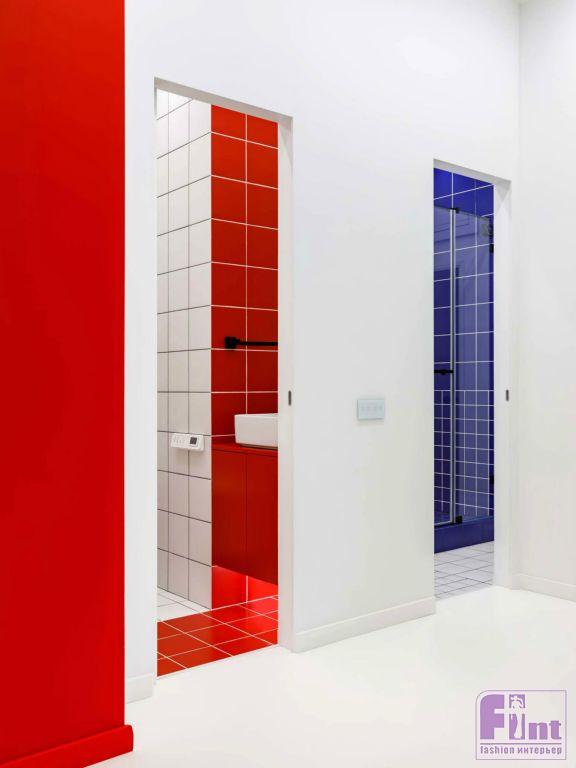 Алым цветом окрашены стены ванной комнаты. Плитка в ванной тоже отсылает к полотнам Модриана, составляя интересную мозаику из красных, синих и белых квадратов. Душевая выложена разноразмерной сине-белой плиткой, рядом с душевой зоной дизайнер предусмотрел пространство для домашней сауны. В санузле тоже применена акцентная яркая плитка — алая, в то время как основная часть поверхностей закрыта белой плиткой.
