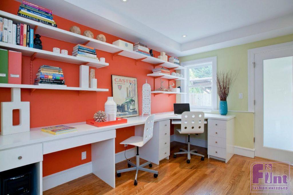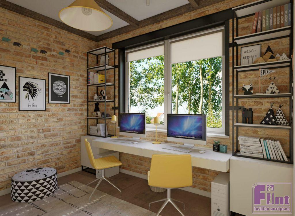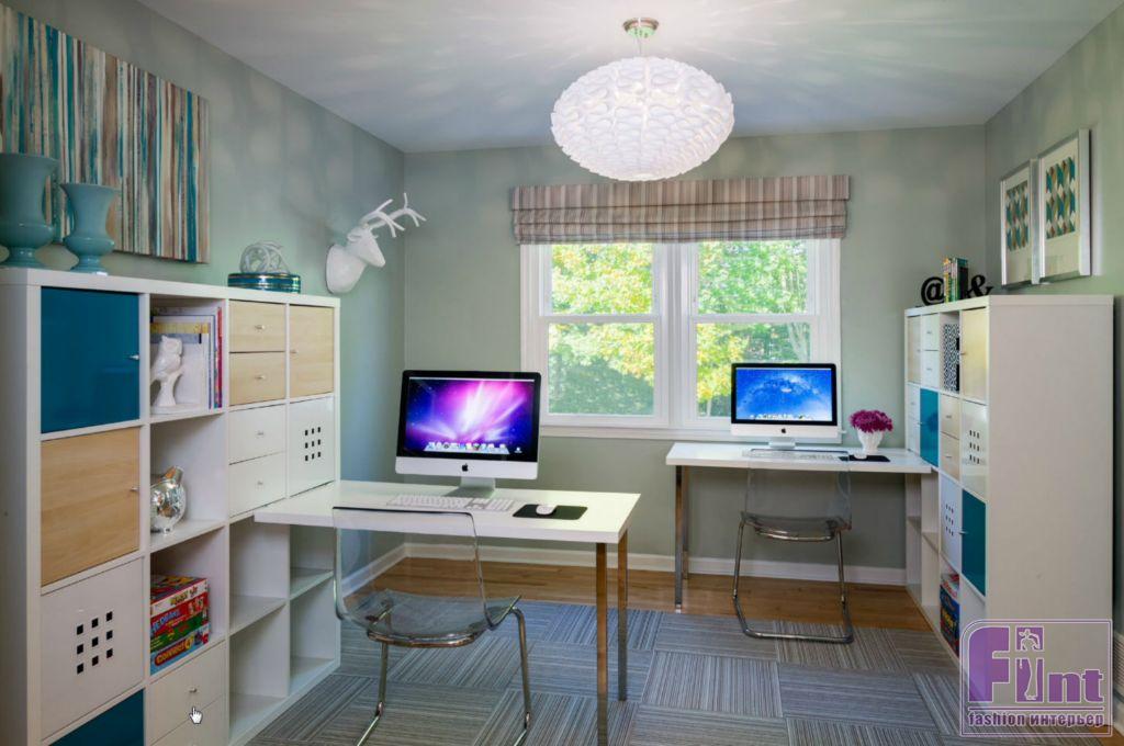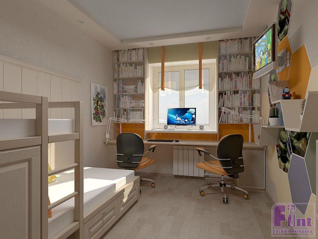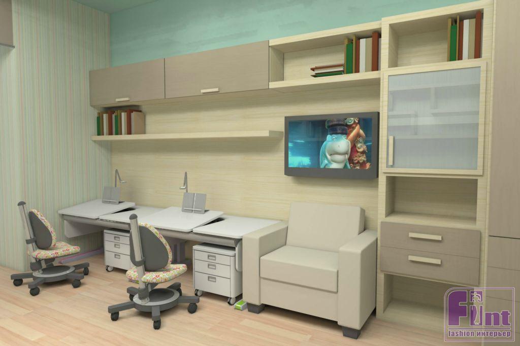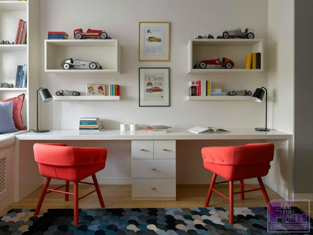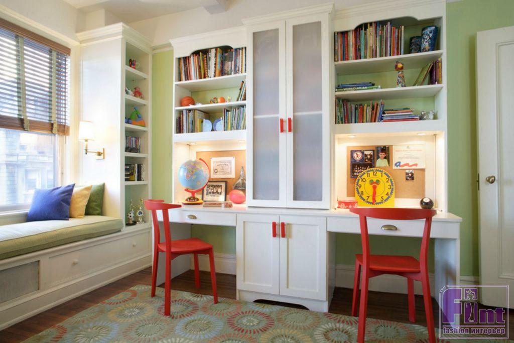 Любой педагог согласится с тем, что рабочее место учащегося ребёнка должно быть удобным. А если мы говорим о комнате для двух детей, то и задача по организации этой зоны усложняется. Цветовую палитру для рабочего пространства лучше выбирать нейтральную. Например, белая мебель в обрамлении зелёных аксессуаров и текстиля. Хорошо подойдут и бежевые оттенки, светло-коричневые. Отдельно стоит продумать удобные подставки и держатели для книг и дополнительное освещение. Тогда помимо естественного света, верхний свет можно разместить ближе к рабочей зоне и дополнить его настенными светильниками.