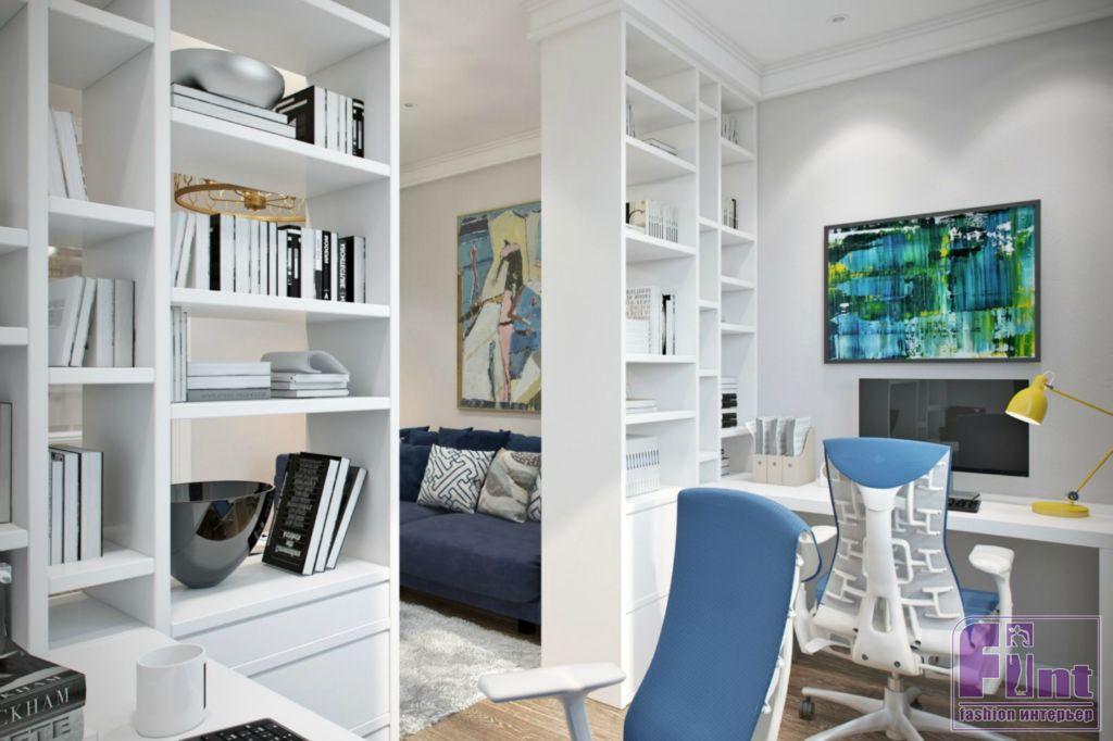 Дальнюю «комнату» занимает девочка, ближе к входу находится «территория» мальчика. При такой планировке в детской комнате может быть даже разное оформление стен и пространства, разная мебель, но при этом интерьер будет единым и гармоничным.
