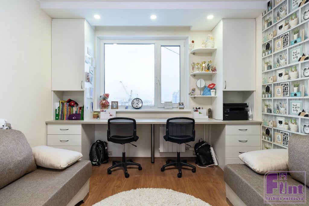 Если помещение позволяет, можно приобрести квадратный стол: его можно разместить в углу комнаты, а с остальных двух сторон получатся полноценные рабочие места. Речь идет не о простом столе – это специальная конструкция с вместительной столешницей, на которой можно поставить два компьютера или монитора, и большой системой хранения в виде ящиков и отсеков для хранения школьных принадлежностей. Также не стоит забывать про возможности подоконников, которые при желании можно трансформировать в рабочий стол для двух детей с помощью широкой и длинной единой столешницы.