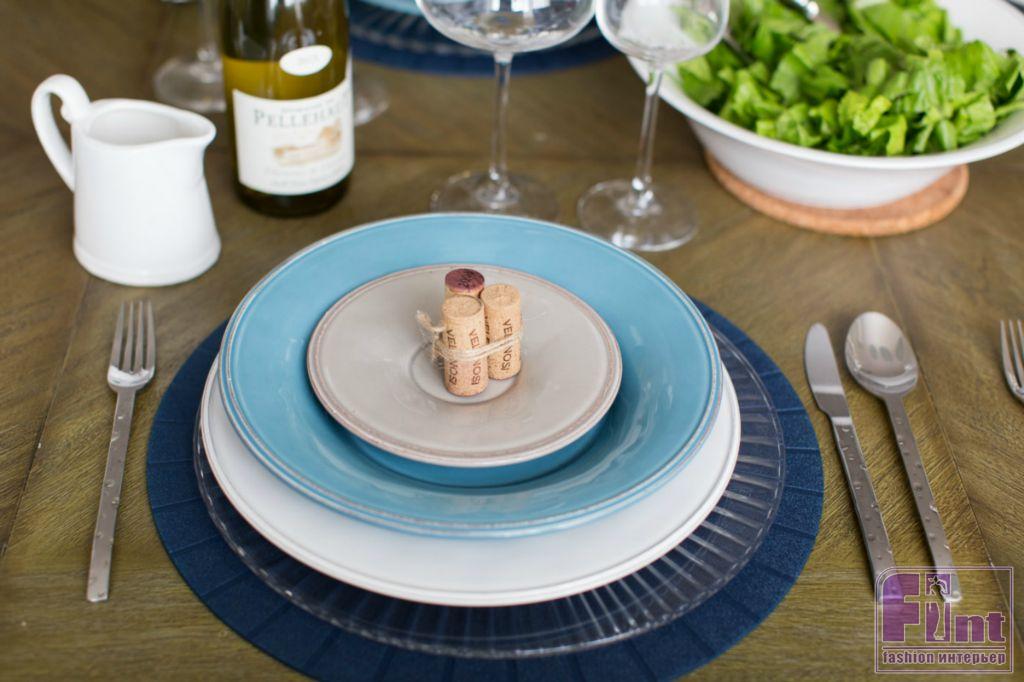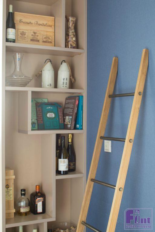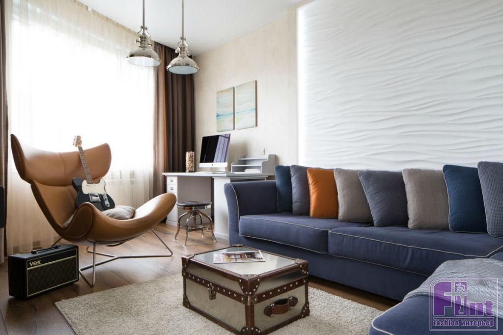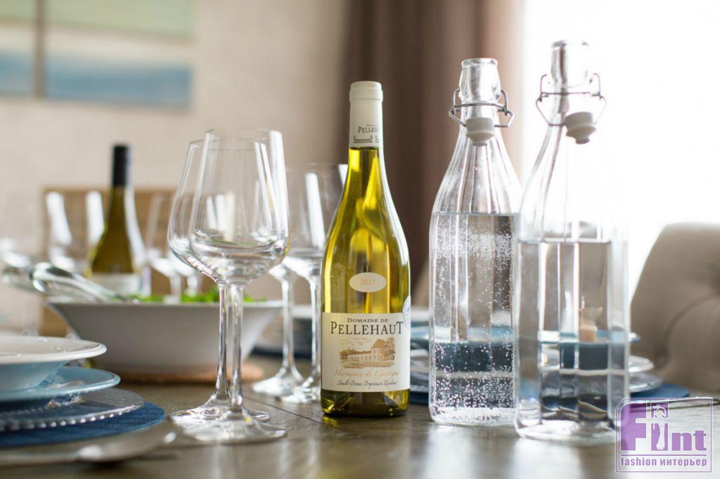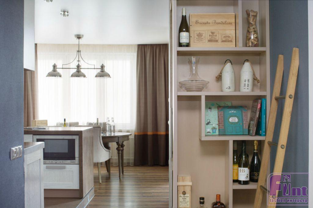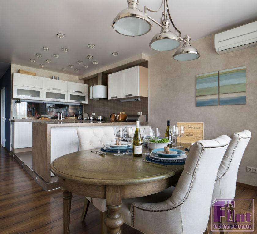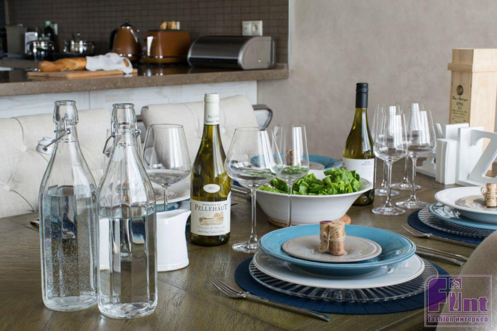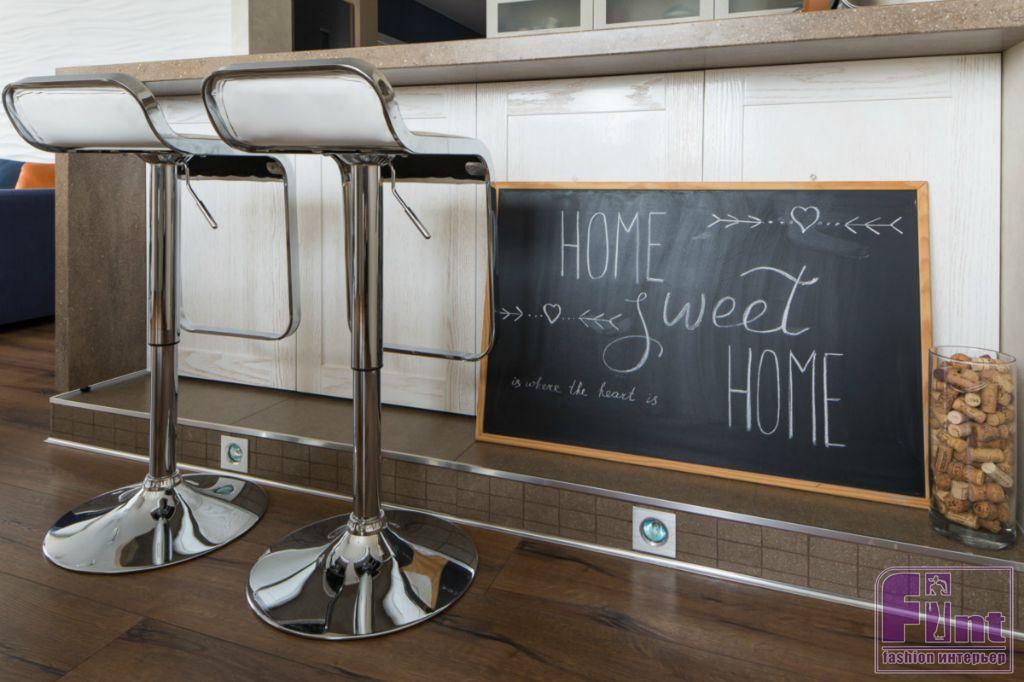 В открытом пространстве, объединяющем кухню и гостиную, стилеобразующими элементами стали гипсовые 3D-панели за диваном, напоминающие морские волны. Зона приготовления пищи возвышается на небольшом подиуме. Кухонная вытяжка напоминает маяк, который притягивает своим необычным освещением, а фартук на кухне обозначает интерес хозяев к винам.