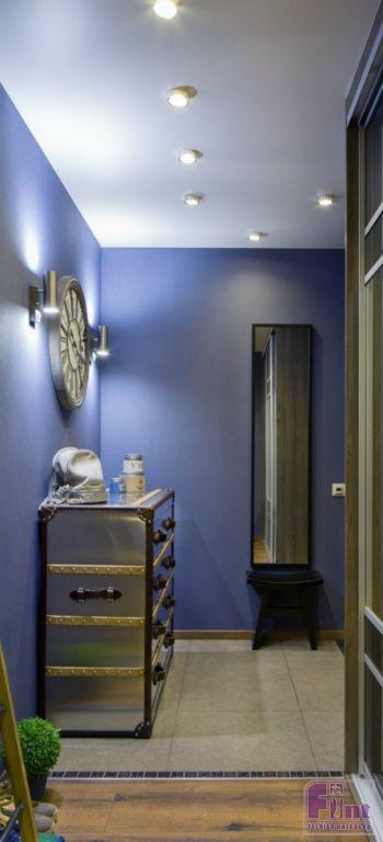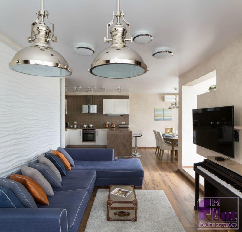 В объединённом пространстве дизайнер весьма оригинально решила вопрос освещения, введя в интерьер несколько типов светильников. Группа потолочных источников искусственного света напоминает корабельные иллюминаторы, а две люстры на длинных подвесах выполнены в стилистике океанических лайнеров прошлого века. Эти светильники обеспечивают освещение рабочего места хозяина квартиры.