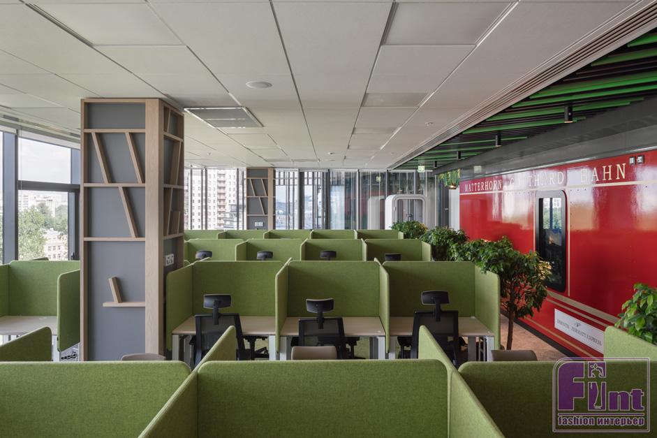 Рядом с рабочими местами находятся многочисленные зоны коллаборации, а также места для уединённой работы, которые расположены как внутри опен-спейса, так и полуизолированные, в ярких нишах. На каждом этаже также присутствуют несколько переговорных комнат со всем необходимым оборудованием и зоны для приёма пищи. По всему офису разбросаны «зелёные» острова, мягкие диванные группы и кофе-пойнты - для неформального общения и отдыха. Тема отдыха поддержана наличием в офисе специальных комнат для настольных и компьютерных игр, библиотеки, стеллажа, которой выполнен в виде дерева, а также биомастерской c просторными вольерами для животных. Также в офисе есть учебные классы, которые при необходимости объединяются с помощью трансформируемых перегородок.