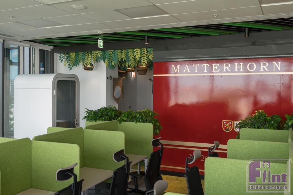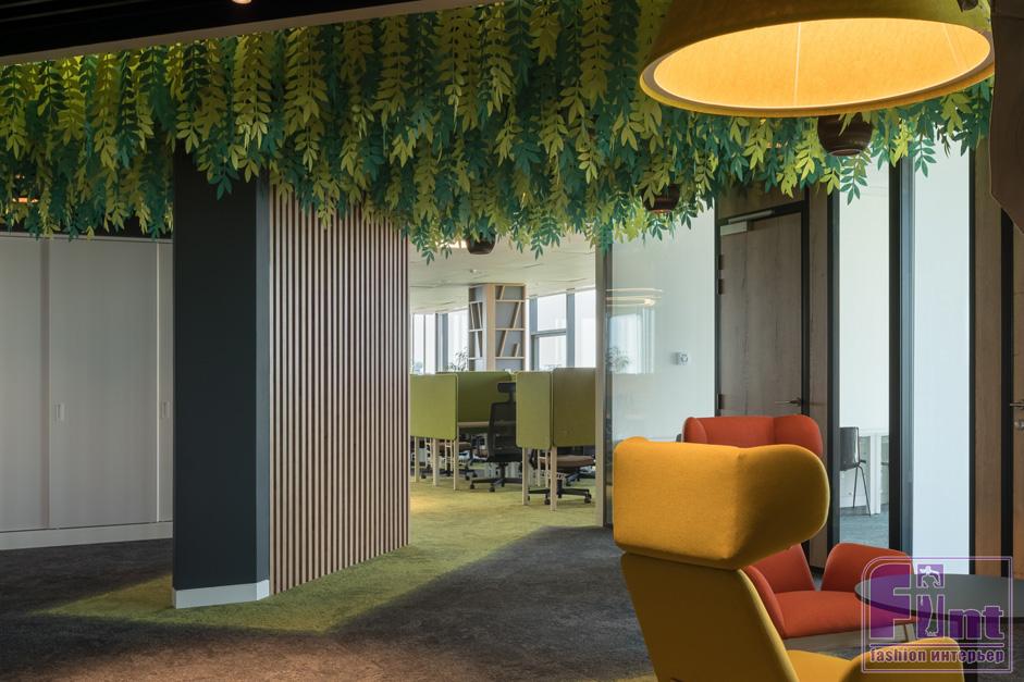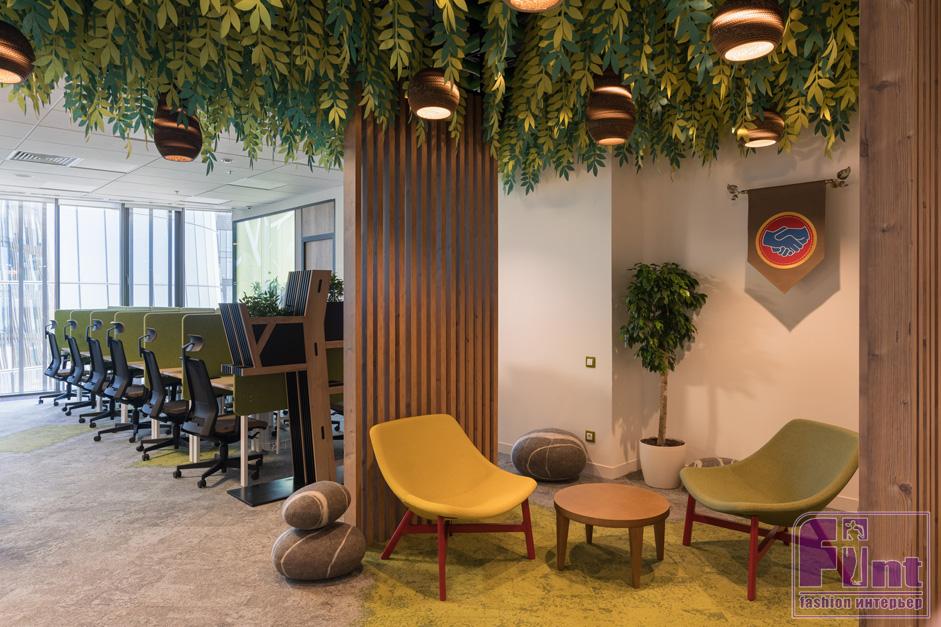 Тема природы прослеживается во всех пространствах офиса. В некоторых офисных зонах для декорирования стен использована необычная штукатурка, имитирующая кору дерева. Цвет и фактура ковролина напоминает зелёный покров леса с протоптанными дорожками. Деревянная отделка потолка в коридоре, искусственная трава на стенах, большое количество пуфов-булыжников, «разбросанных» по офису, деревянные рейки, зонирующие пространство, живые растения в интерьере – всё это также отсылает к загородному ландшафту и отлично дополняют природную тему. Интересным декоративным решением стало использование при оформлении потолка входных зон офиса листвы, выполненной из огнеупорной бумаги.