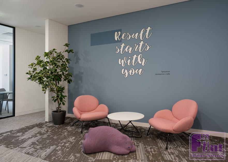 В результате на трёх этажах бизнес-центра появилось современное, удобное и стильное пространство, которое отражает общую атмосферу компании – творческую и неформальную. Для своих сотрудников компания Авито сформулировала 7 ценностей, для каждой из которых архитекторы предложили уникальную иллюстрацию в выбранной природной тематике, основанную на базовом элементе - листе. Каждая такая иллюстрация, соответствующая определённому слогану, размещена в виде настенной графики в той части офиса, где она звучала бы максимально актуально. Например, фраза «Keep it simple» расположена на стене в open space, «Use data to decide», обыгранная двоичным кодом – в переговорных комнатах, «Put users’ needs first» - в кухонной зоне. Фраза «In team we trust» довольно просто и оригинально описывает разницу между командной, доверительной, и индивидуальной работой.