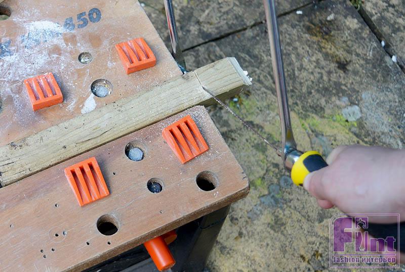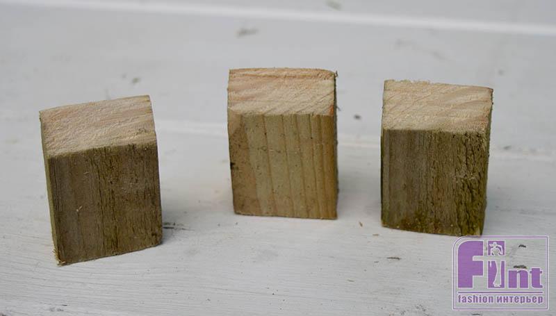 Сначала нам необходимо сделать милые домики. С помощью ножовки разрежьте обрезки дерева на 3 небольшие кусочка примерно 5 см высотой и 2,5 см шириной. Используйте ножовку и для создания остроконечной крыши, отпилив уголки брусков. Не беспокойтесь о том, чтобы получить идеальную форму заготовок. Неровные формы домов придают им их очарование.